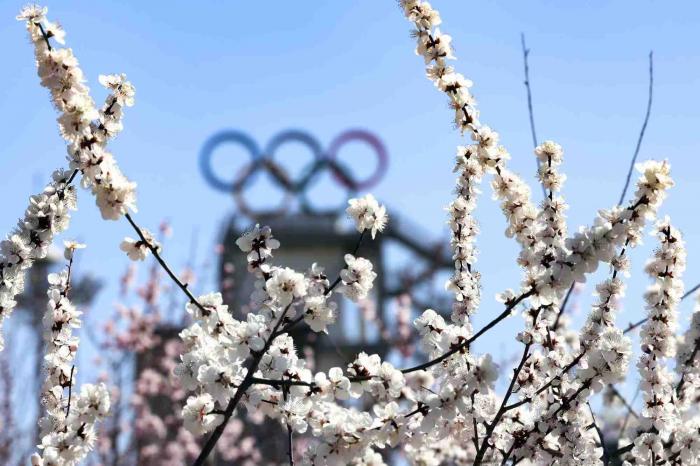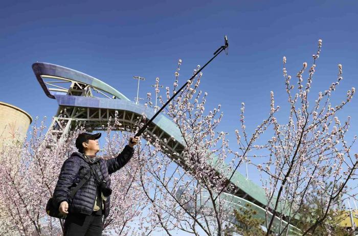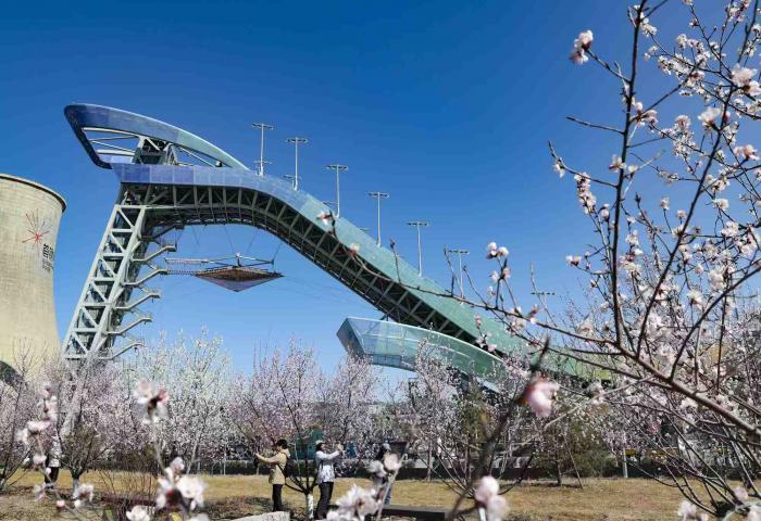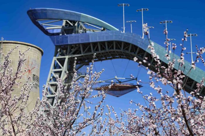 首钢滑雪大跳台下的火车乐园,盛开的桃花吸引游客驻足拍照。