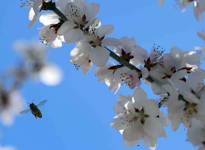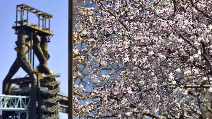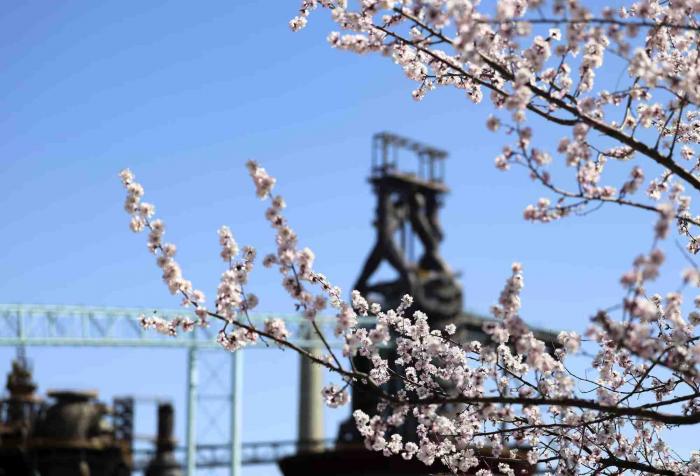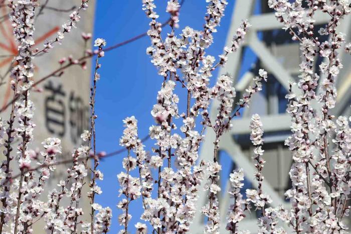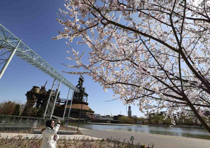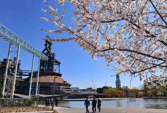 首钢园三高炉秀池旁,盛开的桃花。