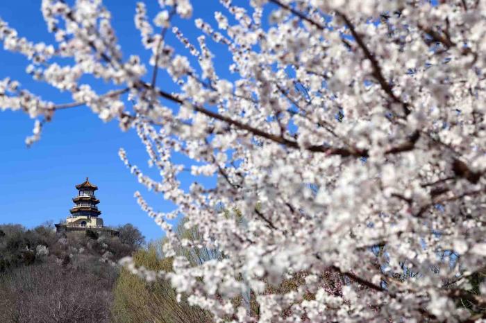 在桃花映衬下的首钢园功碑阁。