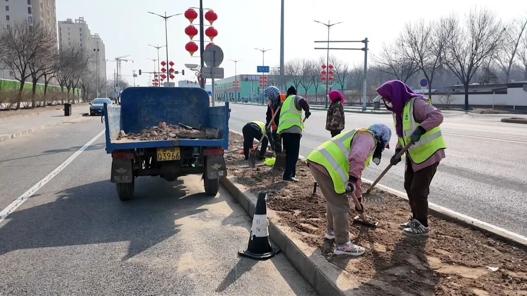 空中环境焕然一新,地面景观也在同步升级。来到杨宋镇瑞丰大街,记者发现道路两旁的矮灌木已不见踪影。工人们正在现场清理花台内的石头树根,平整土坑,为后续绿化改造做准备。