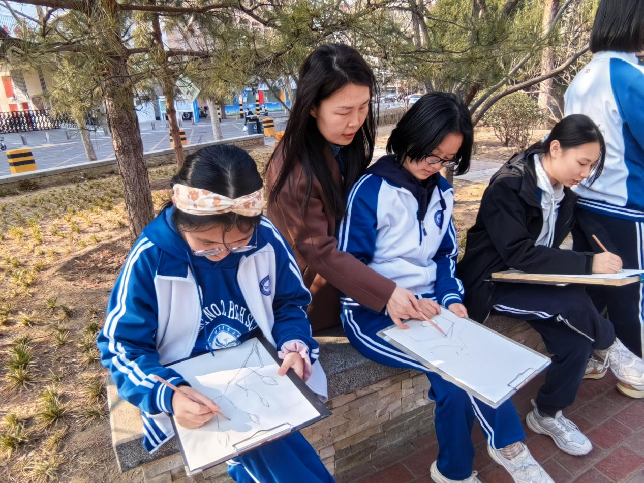 与平日教室里的美术课不同,户外写生赋予学生更大的自主空间。他们可以自由选择角度,从不同维度观察景物,真正成为课堂的主体。一位学生蹲在花坛边,目不转睛地观察花瓣的纹理与新芽的形态,不愿错过任何一处细节;不远处,另一名学生对着一棵斜伸的老树,凝神勾勒枝干的苍劲与灵动。公园里清脆的鸟鸣、铅笔划过纸面的沙沙声,偶尔夹杂着轻声交流,交织成春日里独特的乐章。