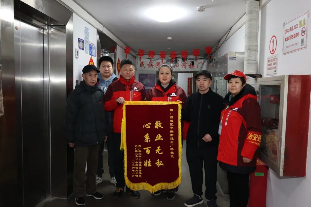 电梯试运行后,居民代表将两面写有“党建引领结硕果,惠民工程暖人心”“敬业无私,心系百姓”的锦旗送到街道和社区工作人员手中,这是220户居民的心意,也是对街道社区工作的高度认可。