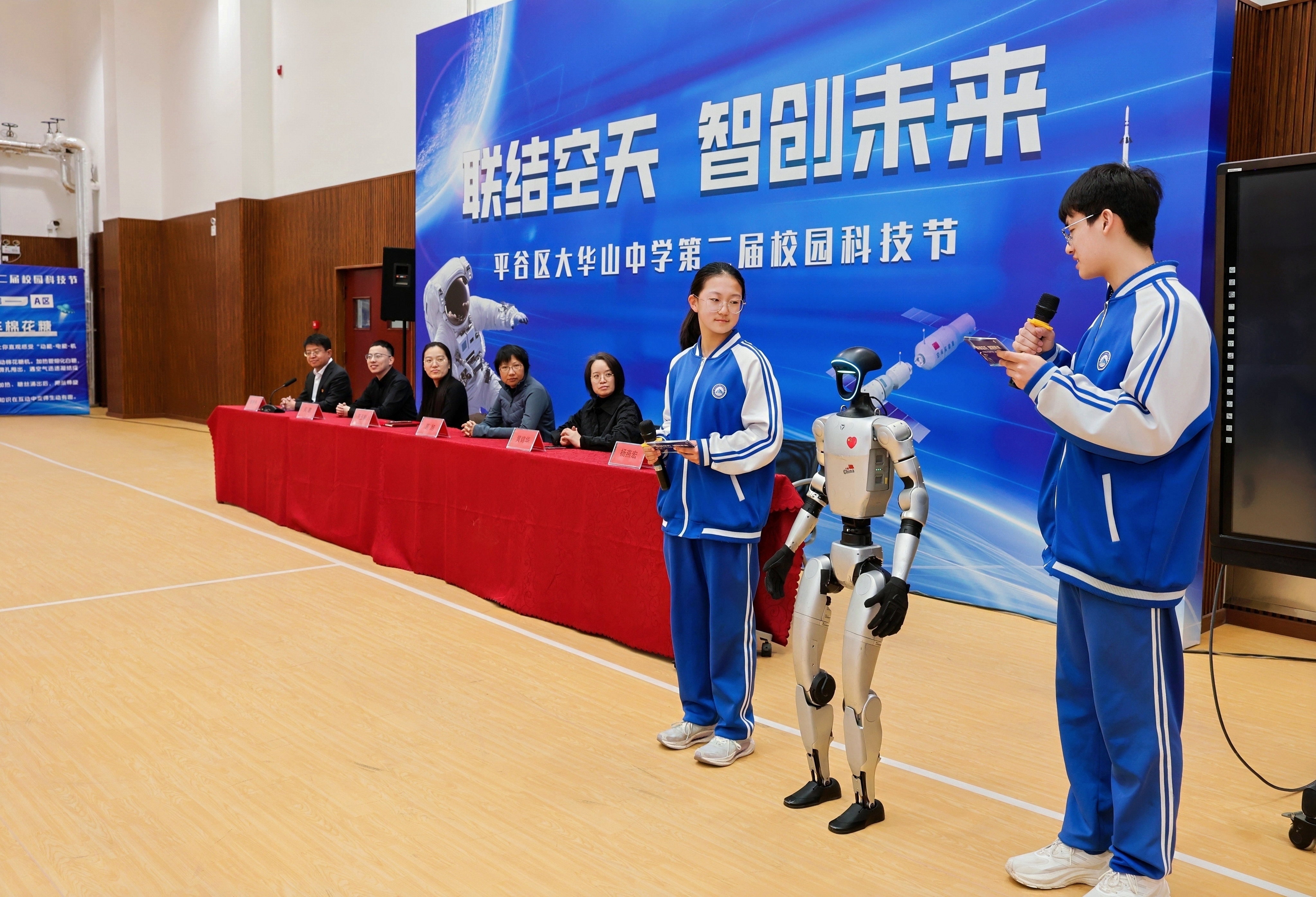 开幕式上,中国宇树科技机器人“小华”与学生同台主持,灵活的身姿、智能的交互表现,瞬间点燃现场气氛,让同学们直观感受人工智能的魅力。“和机器人同台主持太神奇了,我真切领略到了人工智能的魅力。”初二(1)班学生李月雯难掩兴奋。