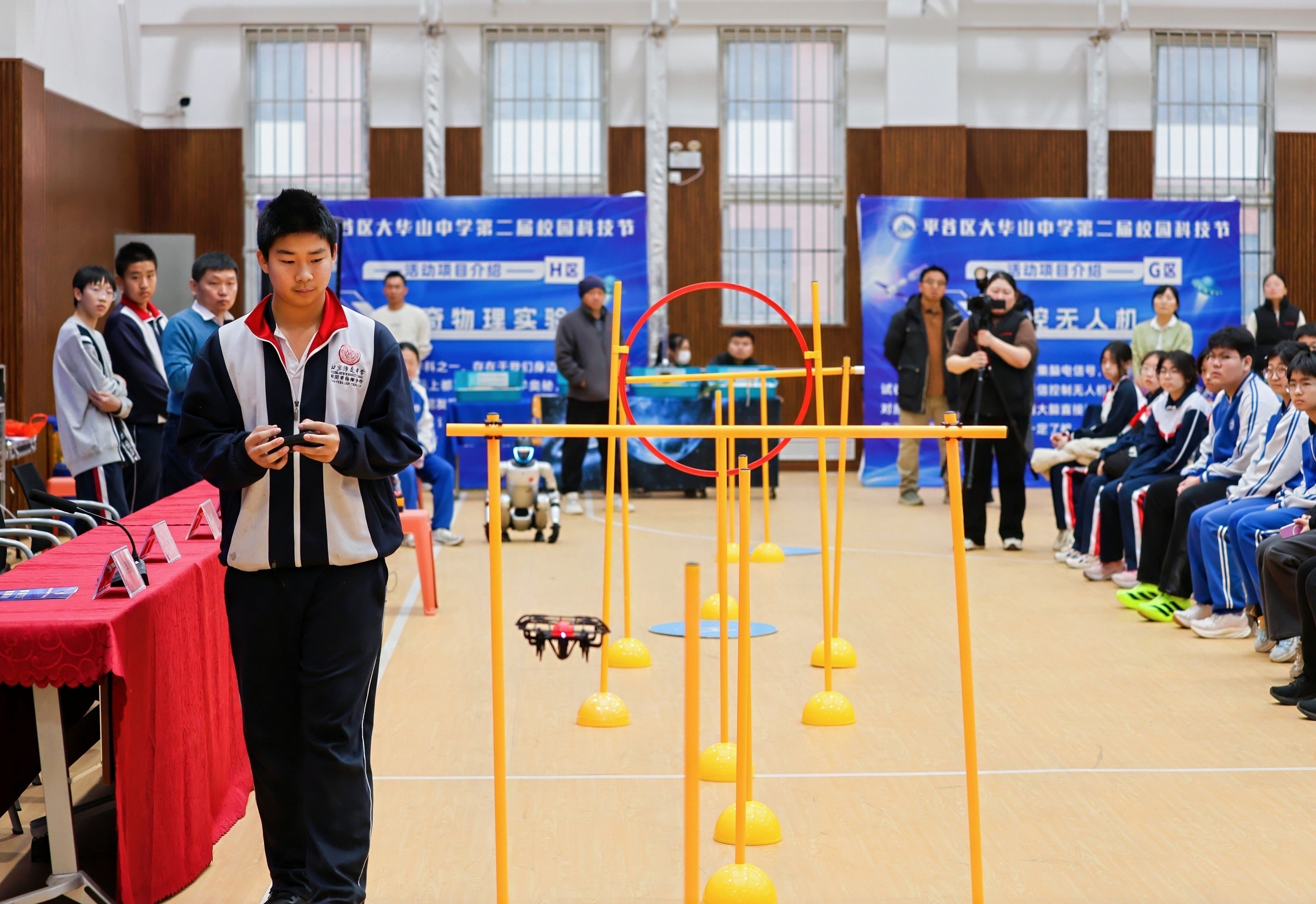 活动现场亮点纷呈,科技感与参与感十足。大华山中学名誉科技副校长吴鹏带来北斗知识科普讲座,用通俗语言解读空天科技的奥秘,从精准测量到守护国门,激发了同学们对星空的向往。在科学汇演环节,魔术与科学原理的结合揭开神奇现象的面纱。北京汇文中学朝阳垂杨柳分校带来的无人机表演,以灵活穿梭、精准定位的精彩表现,将现场气氛推向高潮。在体验展区,“中国天眼”模型、灵巧机器狗、意念赛车等科技项目轮番亮相,学生们亲自动手操作,沉浸式感受科技魅力。“只要集中注意力,无人机就能跟着意念起飞。”初三(2)班学生刘忻彤体验脑控无人机后直呼神奇。初三(1)班学生王奕嘉则表示,此次体验让他看到了未来人机交互的无限可能。此外,“科学小记者”们主动与专家面对面交流,思维的火花在互动中迸发。大华山中学党支部书记、校长张艳伟表示,科技节是科学思想与创新实践的生动联结。他鼓励同学们以好奇为舟、实践为径,在科技海洋中探索前行。