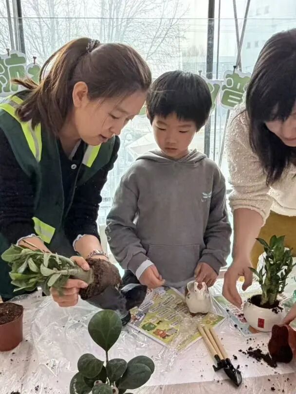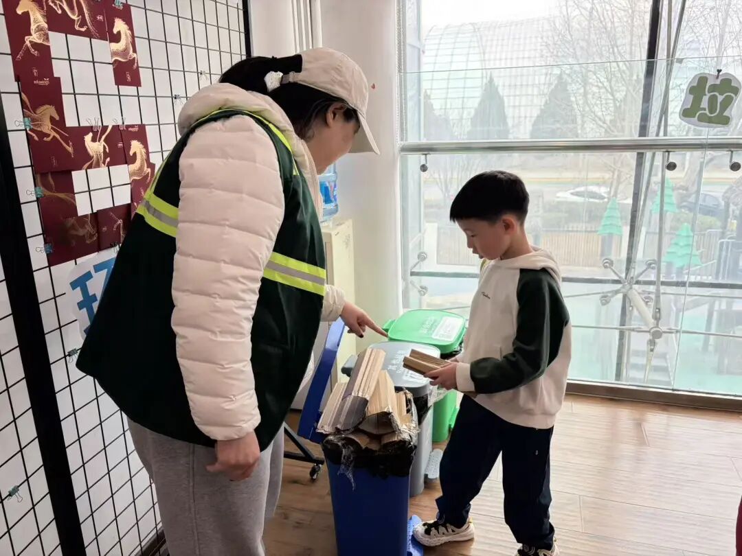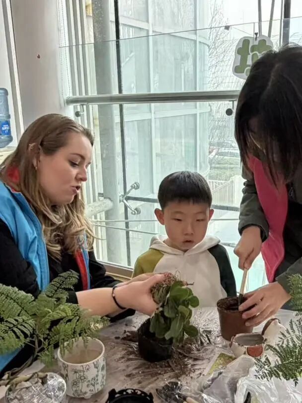 活动以“惊蛰小讲堂”开场,园艺老师用生动易懂的语言为孩子们讲解节气与植物生长的关系。随后,社区工作人员现场开设“垃圾分类微课堂”,结合即将开始的植树活动,让孩子们提前了解如何分类处理后续产生的垃圾。在植树环节,中外儿童携手合作,挖坑、扶苗、填土、浇水,共同种下了十余株象征友谊与希望的树苗。植树结束后,孩子们自觉将肥料袋、矿泉水瓶等垃圾分类投放,并在自制树牌上写下名字和祝福,挂在自己种下的小树上。