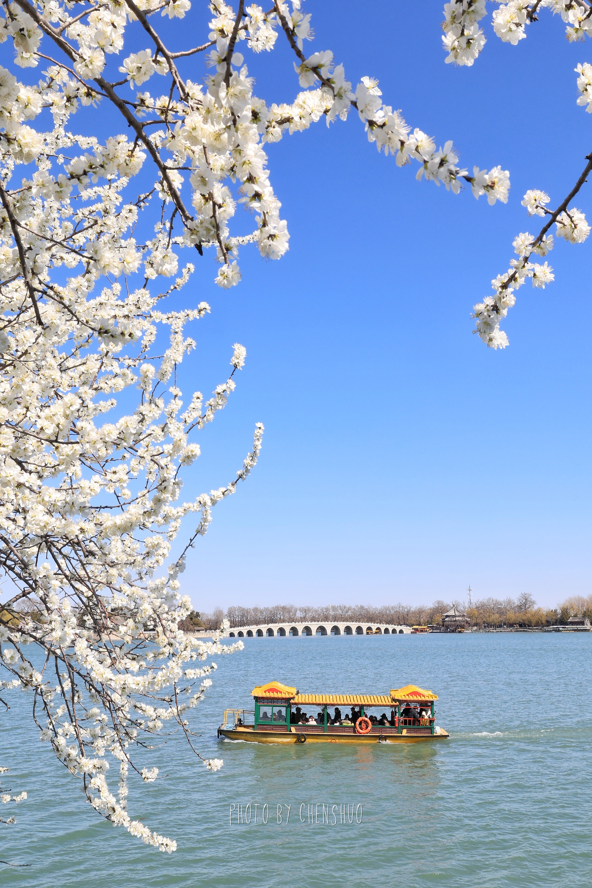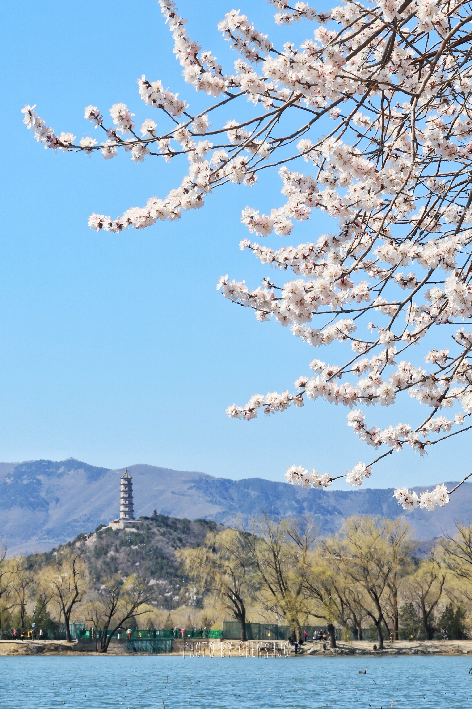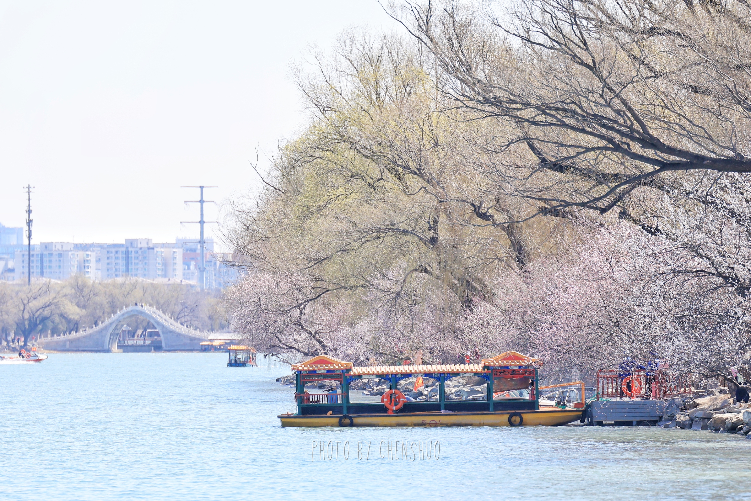 桃柳夹岸、一步一景。粉花临水、新柳吐绿,亭桥点缀其间,远观万寿山巍峨,近看湖面波光粼粼,不用下江南,便能邂逅诗里的烟雨江南。