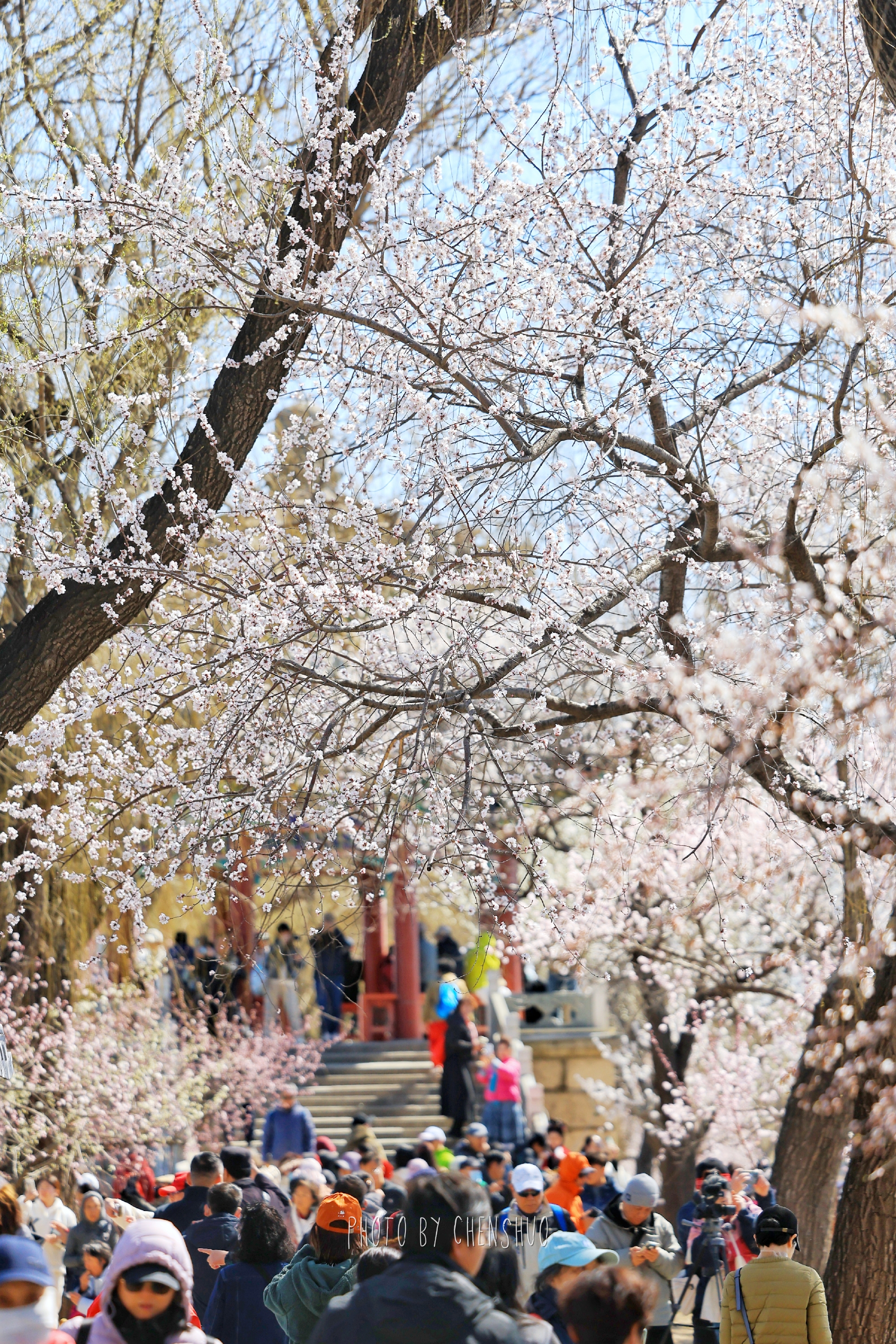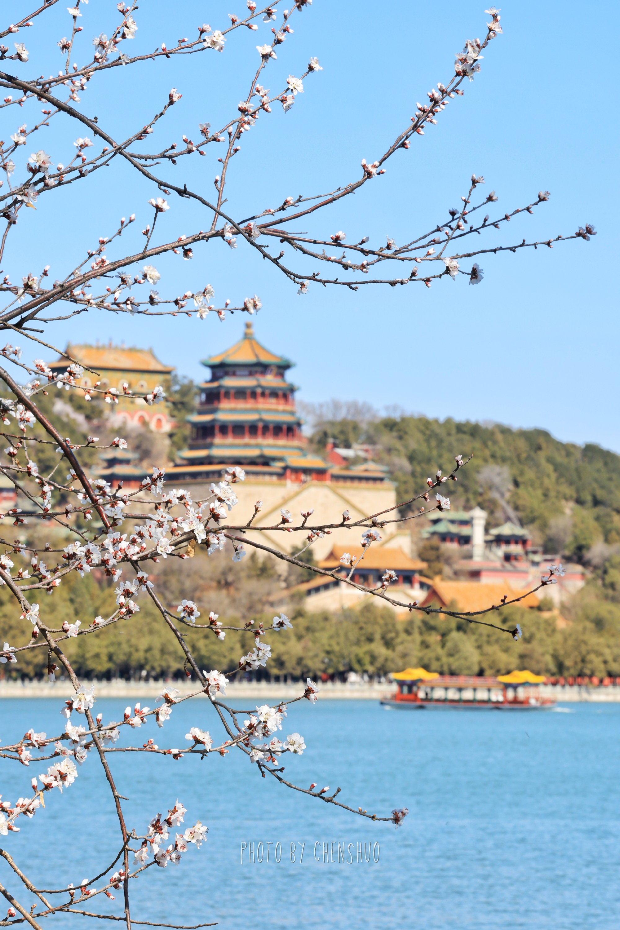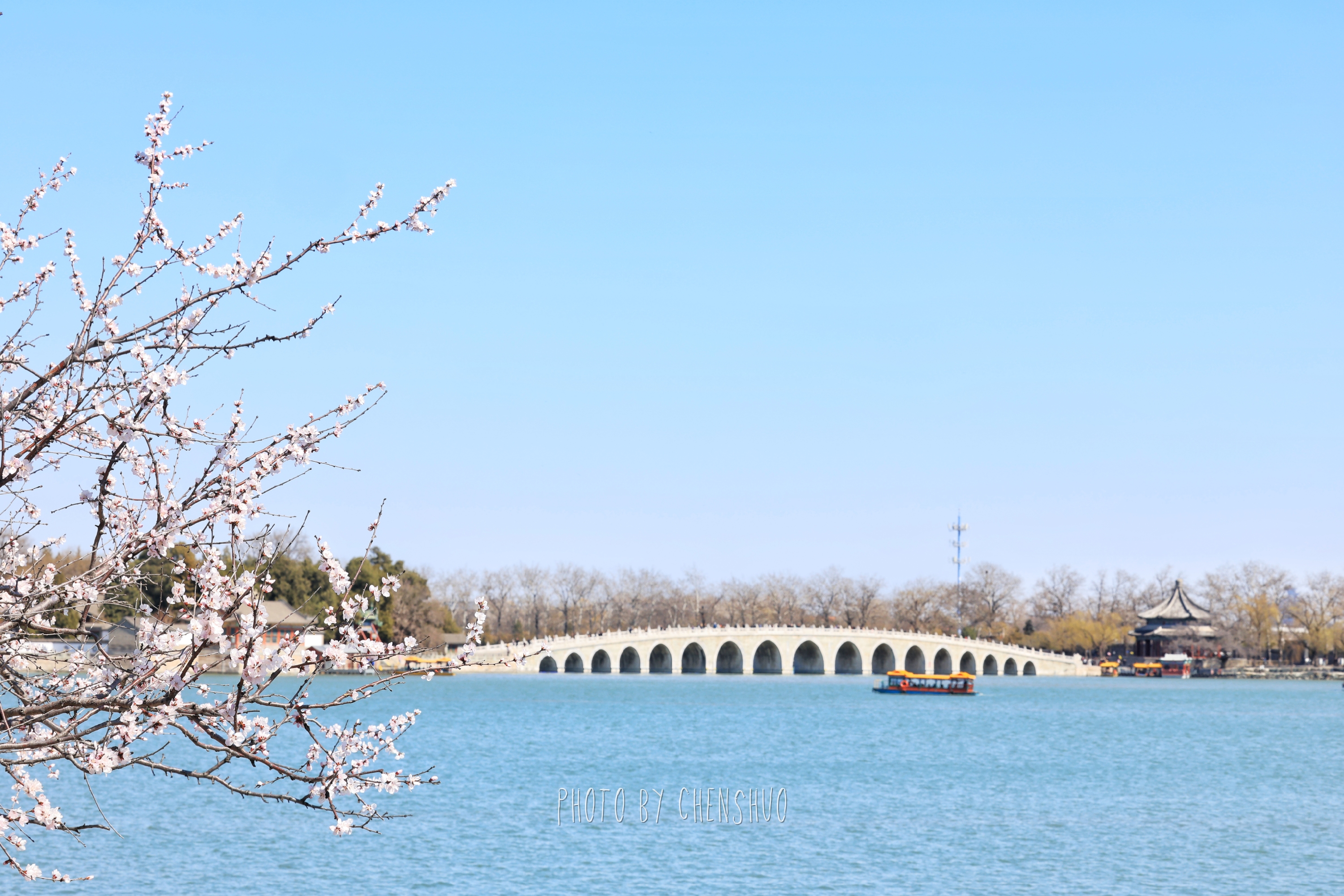 桃柳夹岸、一步一景。粉花临水、新柳吐绿,亭桥点缀其间,远观万寿山巍峨,近看湖面波光粼粼,不用下江南,便能邂逅诗里的烟雨江南。