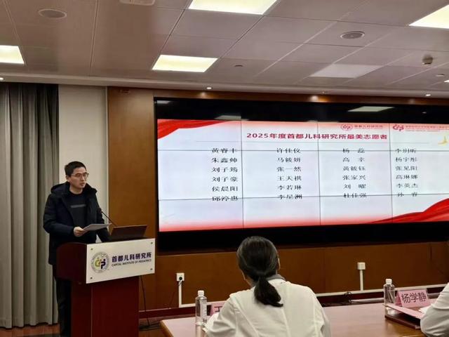 春风送暖,初心如磐。为大力弘扬“奉献、友爱、互助、进步”的志愿服务精神,发挥先进典型示范引领作用,2026年3月13日下午,首都儿科研究所召开2025年度志愿服务总结暨表彰大会。副所长邰隽、社会工作部主任杨学静、转化遗传党支部书记王建华、北京卫生职业学院医学技术系系主任杨德武及首儿所医护人员代表、社会组织和志愿者代表齐聚一堂,共同参与此次表彰大会。