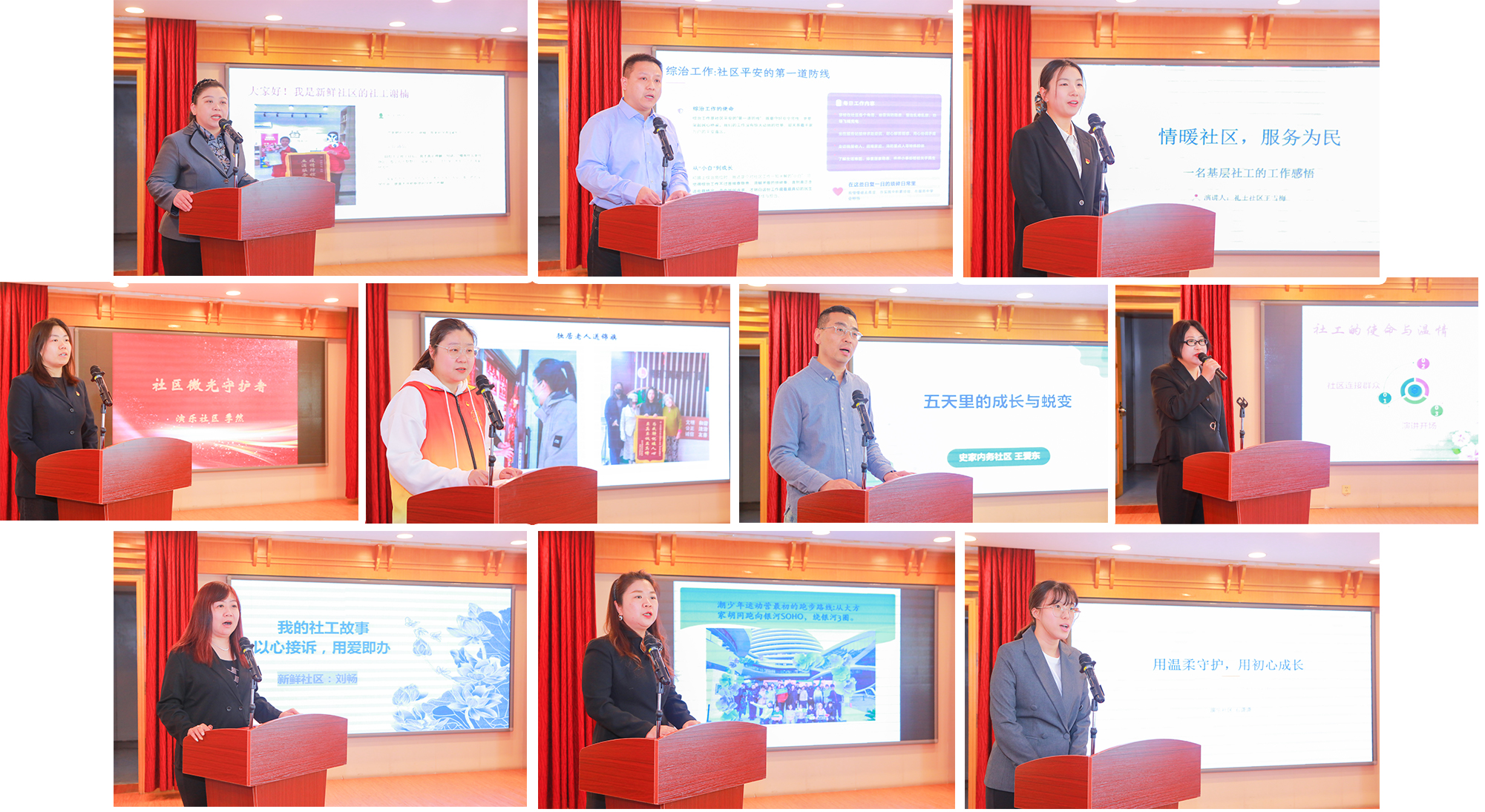 本次比赛自启动以来,历经社区选拔、初赛层层角逐,最终来自7个社区的10名优秀社工脱颖而出晋级决赛。为提升参赛水平,街道赛前特邀专业主持人开展专项指导,围绕演讲技巧、情感表达等核心维度精准赋能,全面夯实社工综合素养。