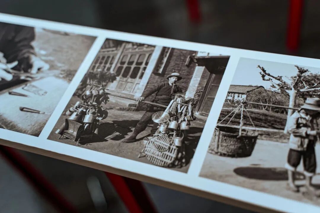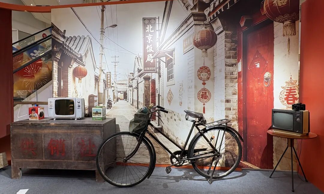 除崇文门地区旧影外,展览还精选20余张记录中轴线沿线历史建筑的作品,包括钟楼、鼓楼、永定门、天坛祈年殿等地标性景观。镜头同样定格了老北京的市井日常:杂耍艺人、磨刀匠人、牵骆驼的行人……一帧帧影像仿佛将旧日时光重现在人们眼前。现场还展出了老式邮政自行车、供销社柜台、复古电视机等老物件,触手可及的怀旧元素,为整个展览增添了浓厚氛围感。