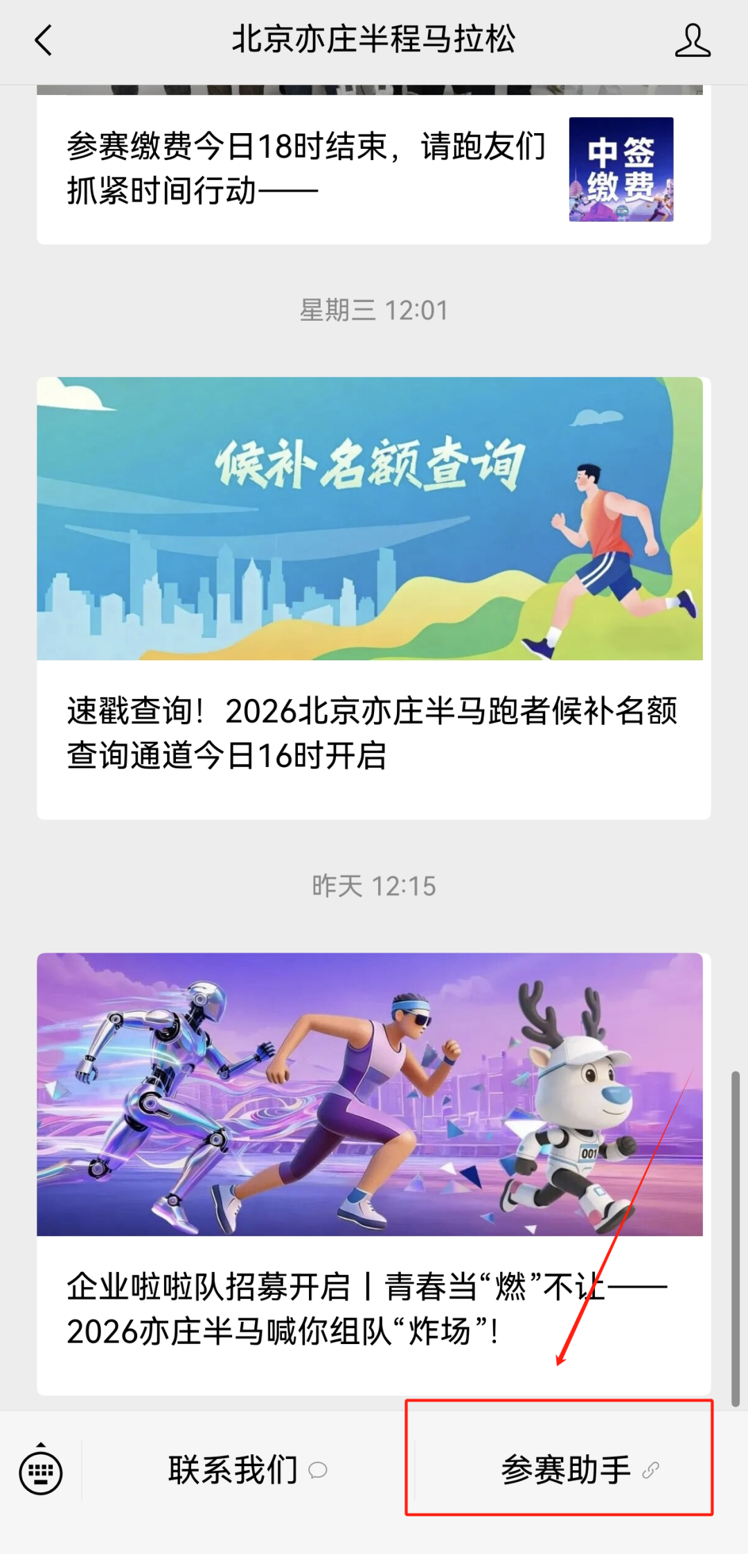 关注【北京亦庄半程马拉松】微信公众号,在菜单栏点击【参赛助手】,进入小程序,进行查询。