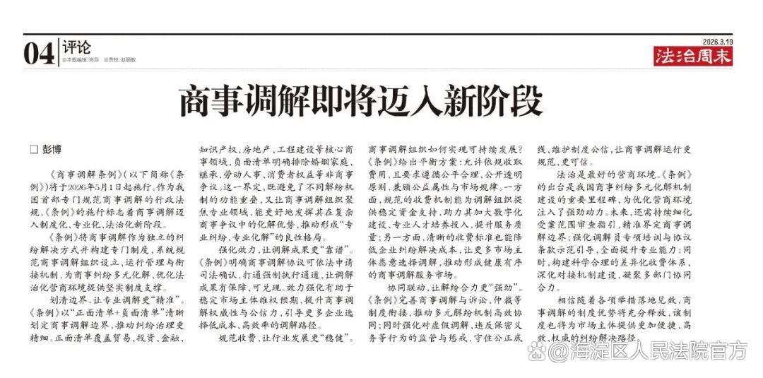 相信随着各项举措落地见效,商事调解的制度优势将充分释放,该制度也将为市场主体提供更加便捷、高效、权威的纠纷解决路径。