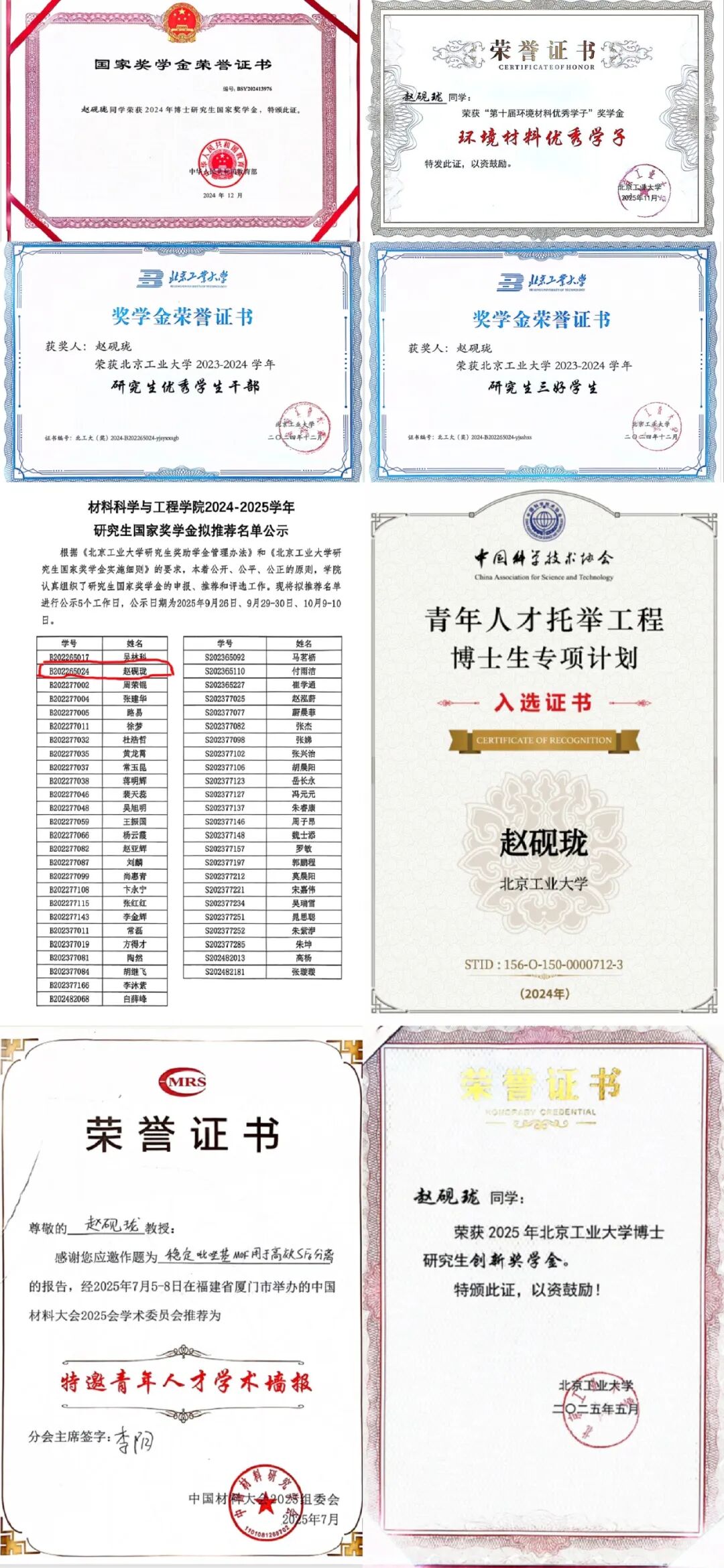学术上,赵砚珑也交出一份扎实答卷。他以第一作者发表SCI高水平期刊论文7篇,总影响因子127;作为主要发明人,已授权国家发明专利3项,另有1项国外专利已受理。至于荣誉,几乎能拿的他都拿了个遍:中国科协青年人才托举工程博士生、博士研究生国家奖学金、校研究生三好学生、校研究生优秀学生干部、校优秀共产党员、校博士创新奖学金、校长奖学金……这些沉甸甸的奖项,记录着他一路走来的每一步。
