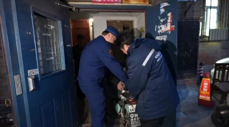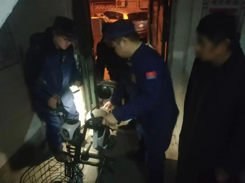当晚另一处地点,消防监督员孙旭光在辖区一社区巡查时,也遇上了“屡教不改”的事情。一辆电动自行车违规停放在楼门过道,而这辆车,孙旭光再熟悉不过——此前他和物业工作人员已经多次上门劝阻,反复讲过违停的火灾风险,可这名居民始终置若罔闻,依旧我行我素。