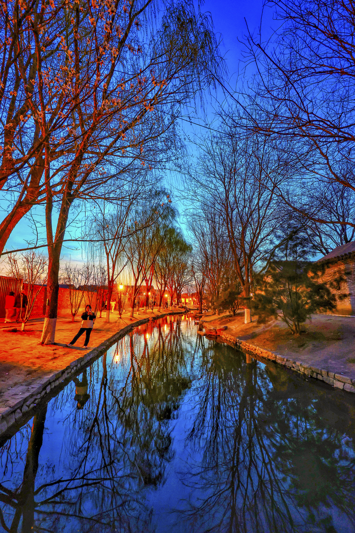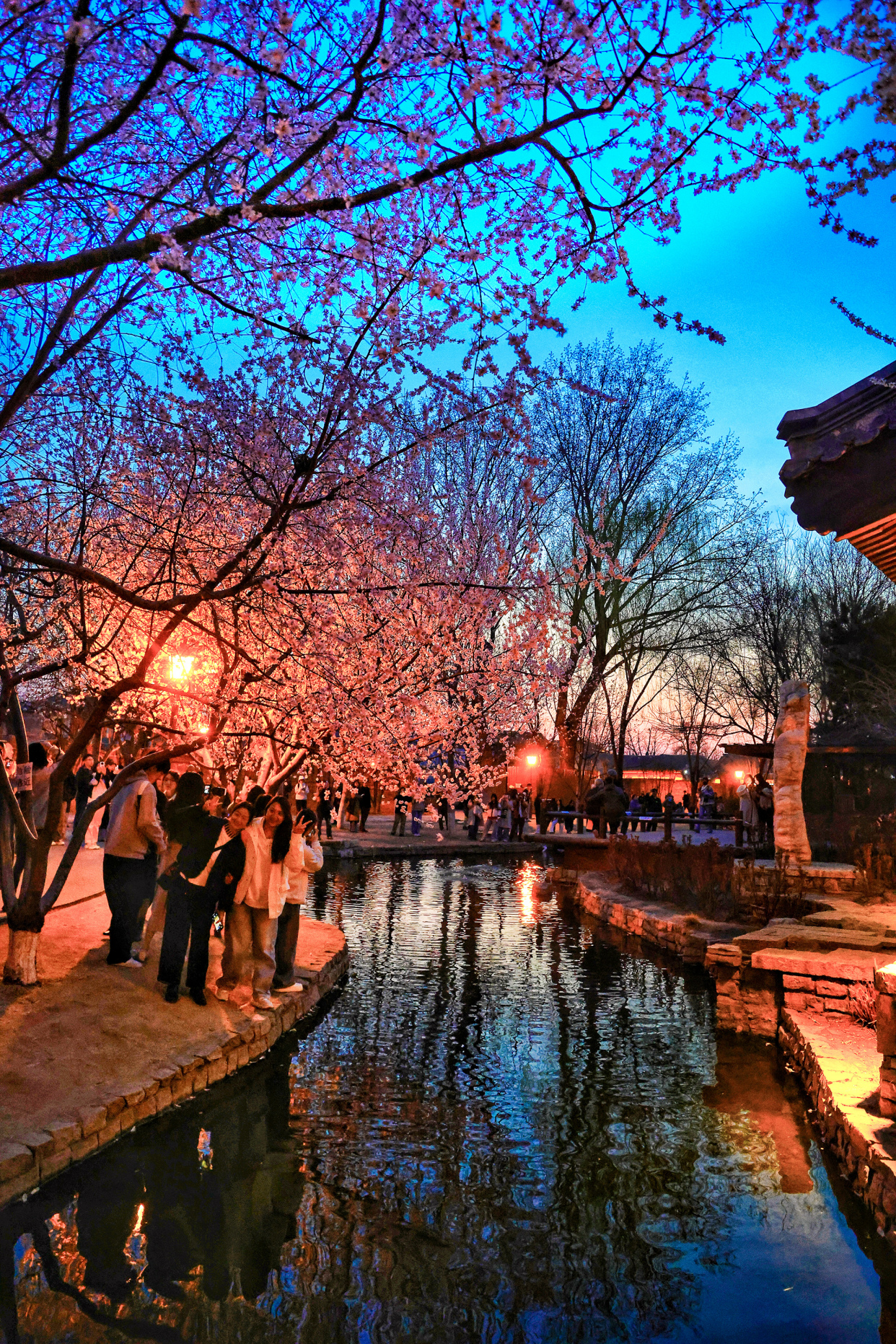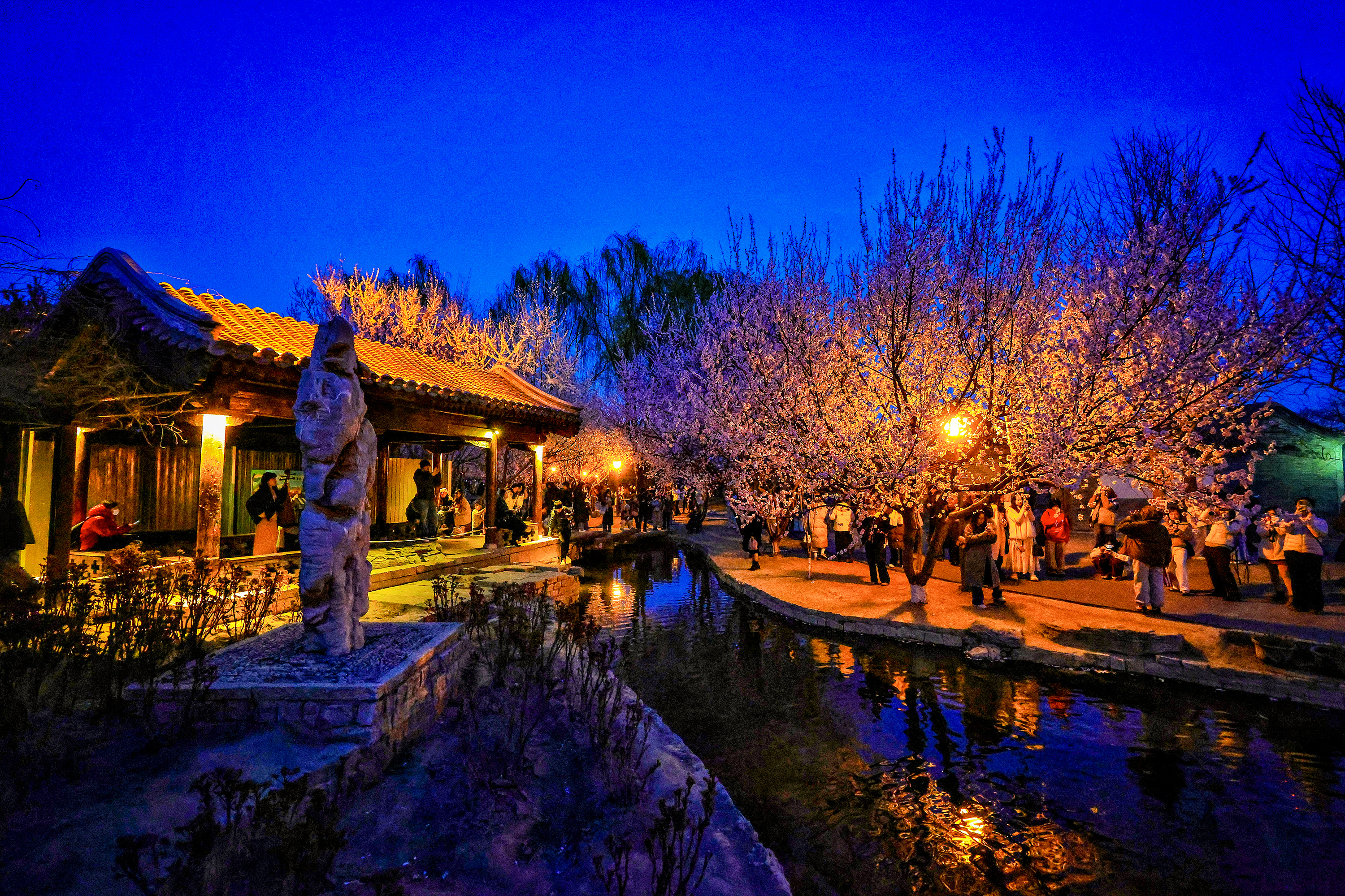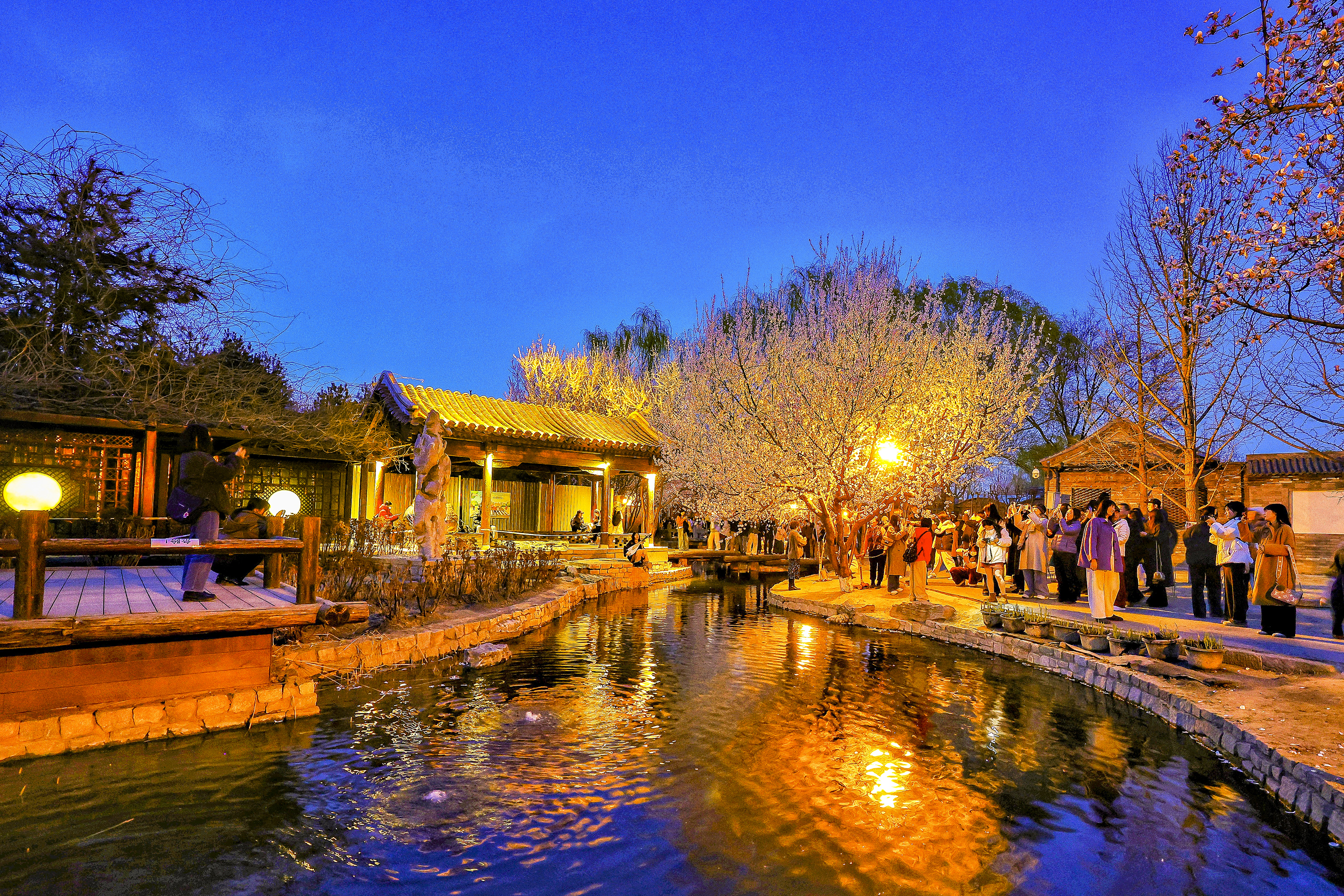 暮色轻笼三里河,蓝调光影携着融融春意,漫过石桥、掠过水岸、拂过花枝。