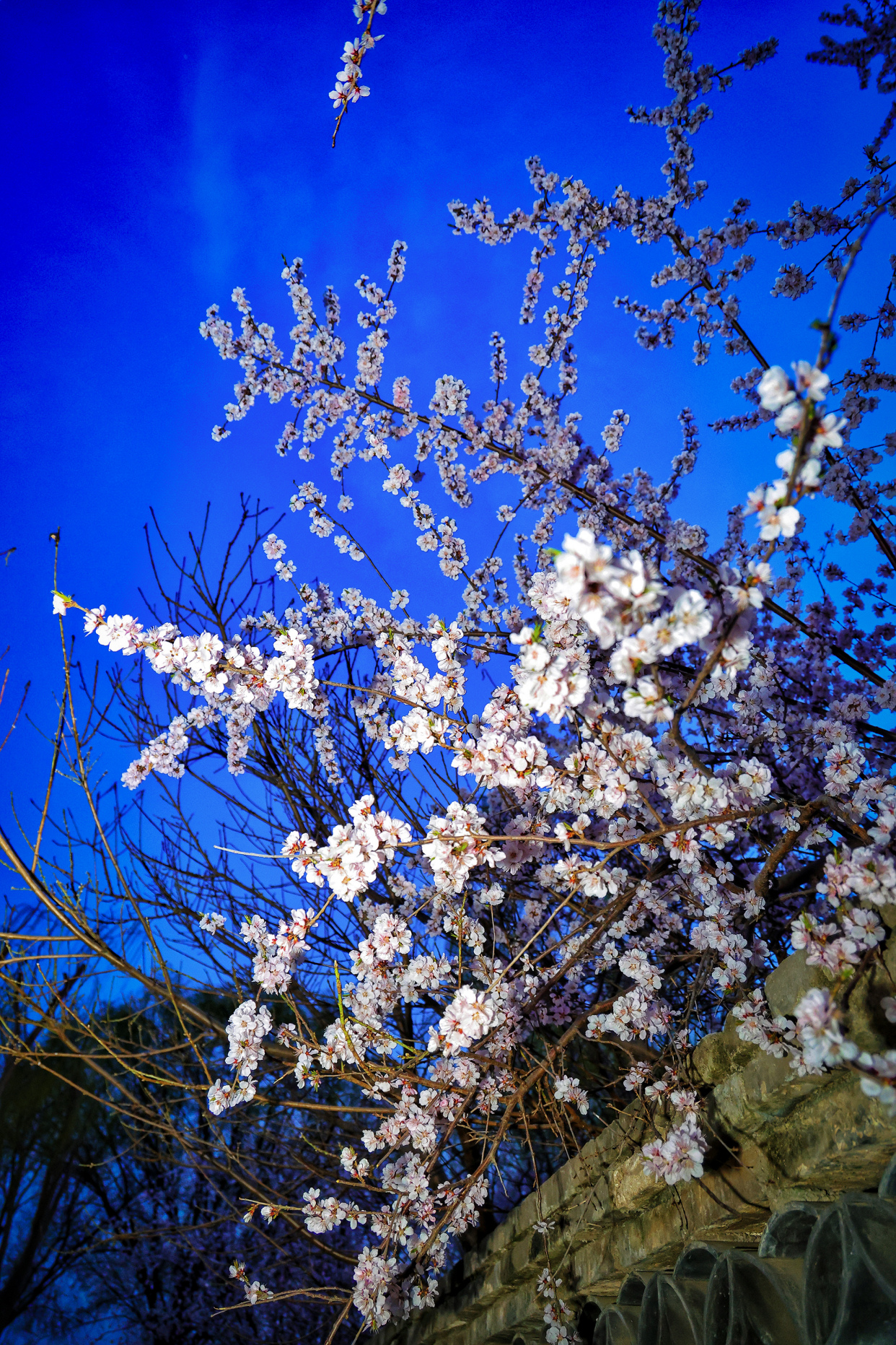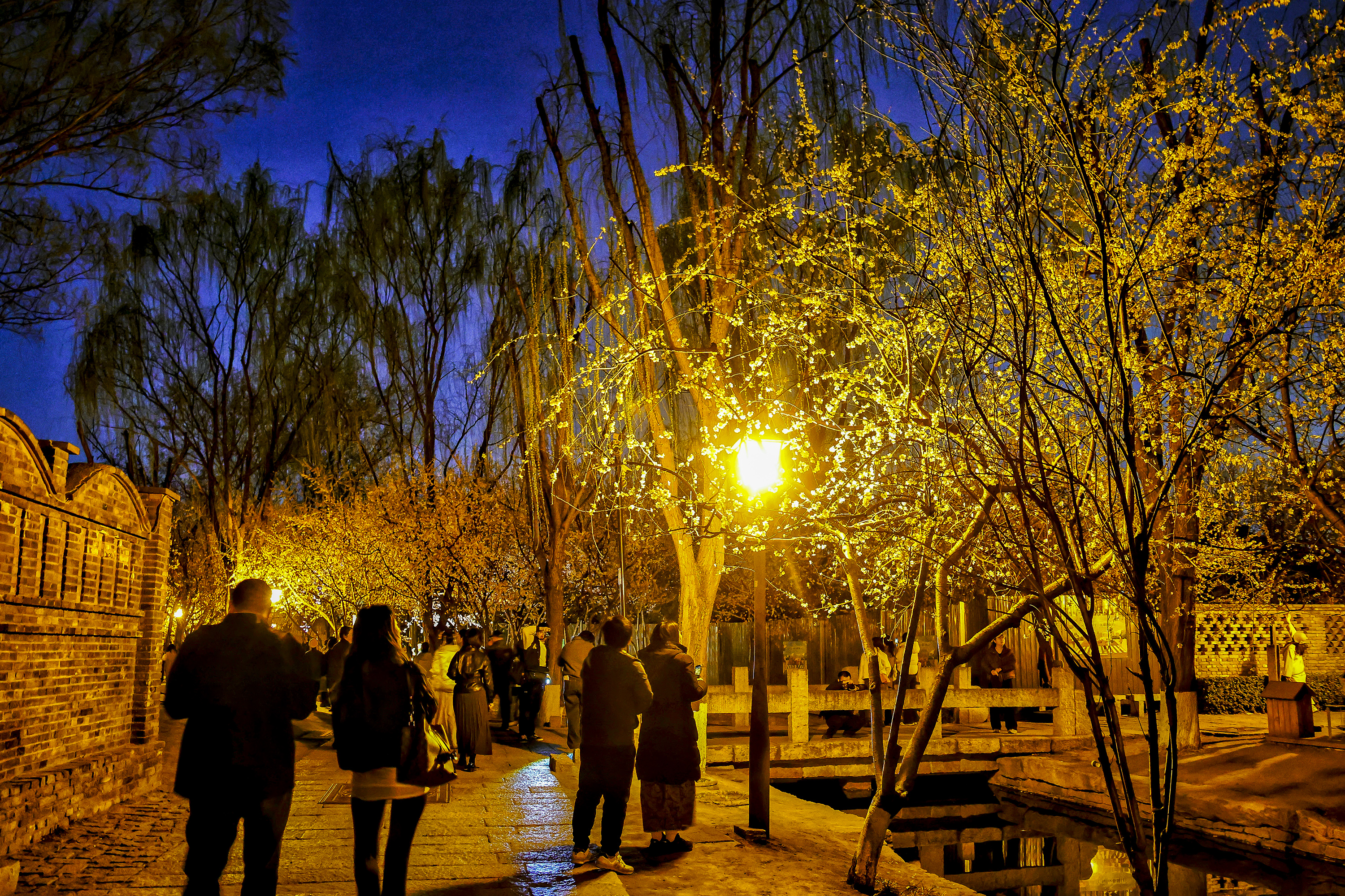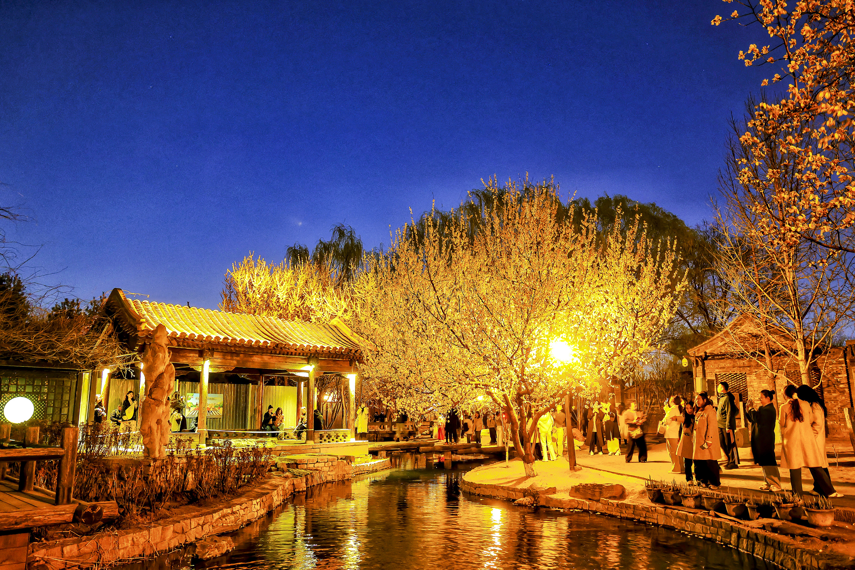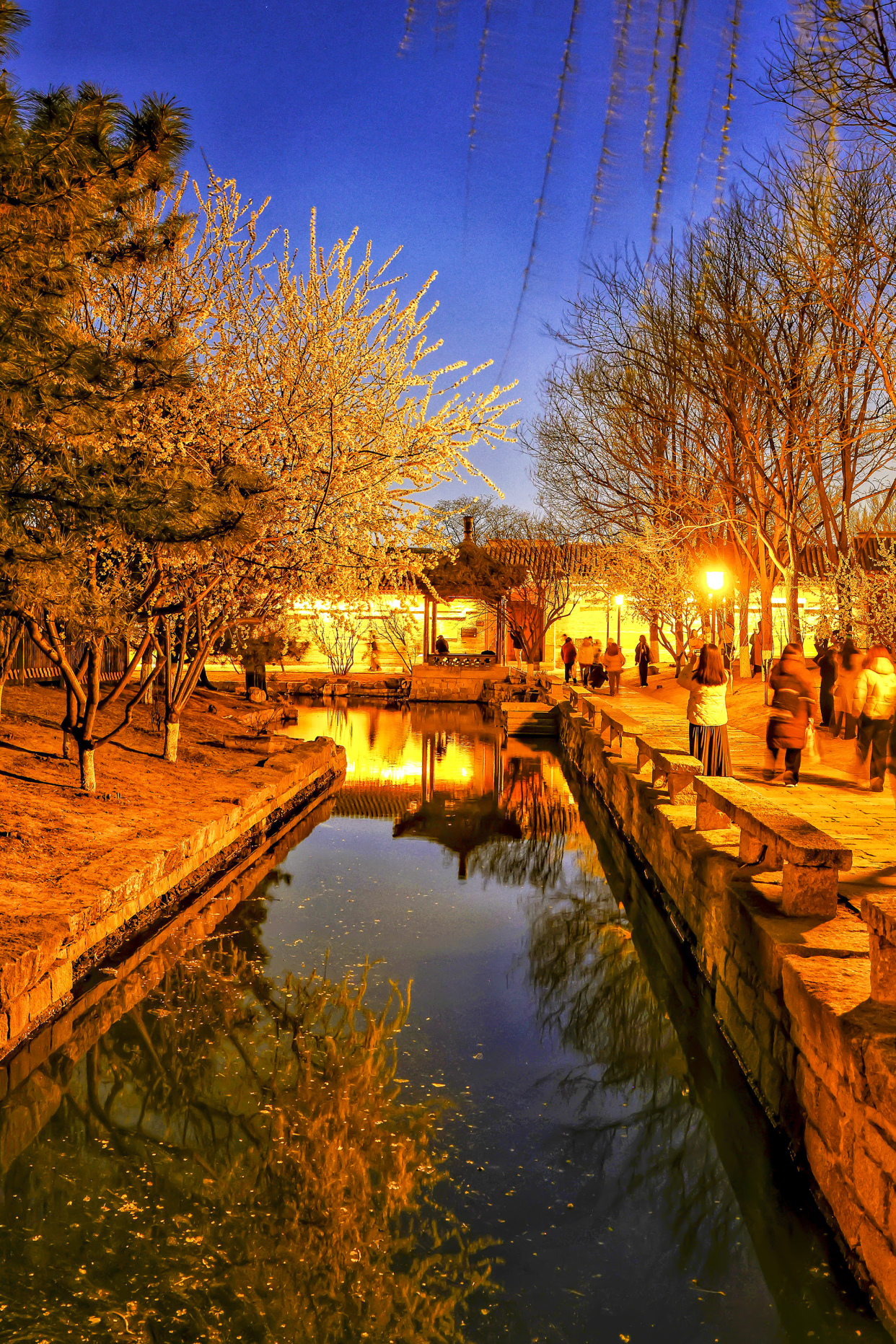 暮色轻笼三里河,蓝调光影携着融融春意,漫过石桥、掠过水岸、拂过花枝。