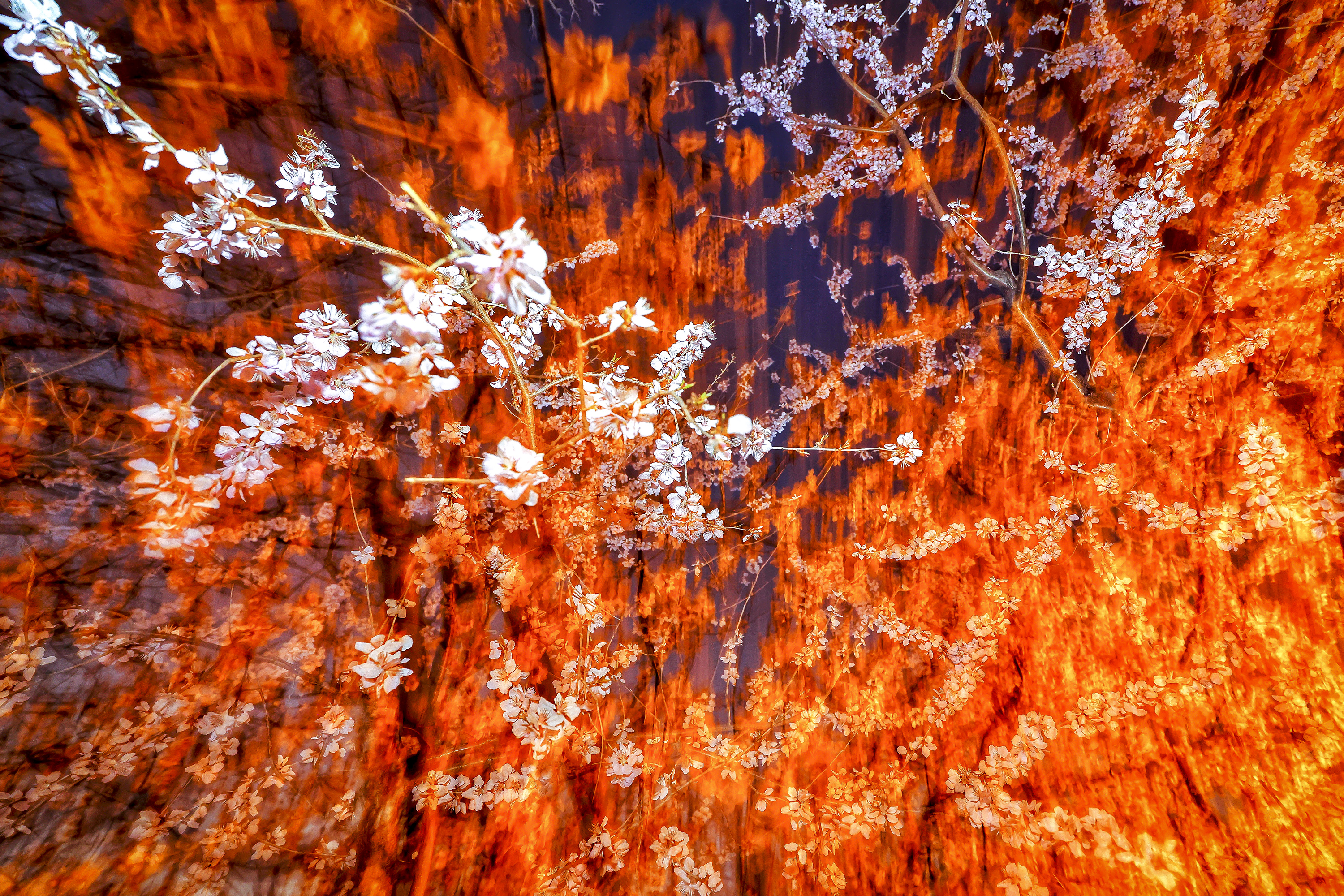 岸边桃花开得正盛,一树树粉白的花影在夜色里看不真切,只觉如云霞般朦胧。风过处,细碎花瓣轻落水面,随潺潺流水漾开涟漪,将春意揉进粼粼波光。