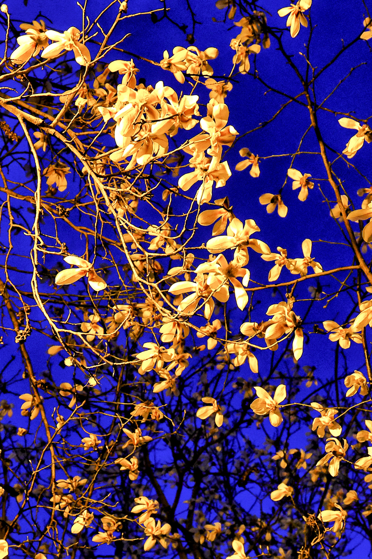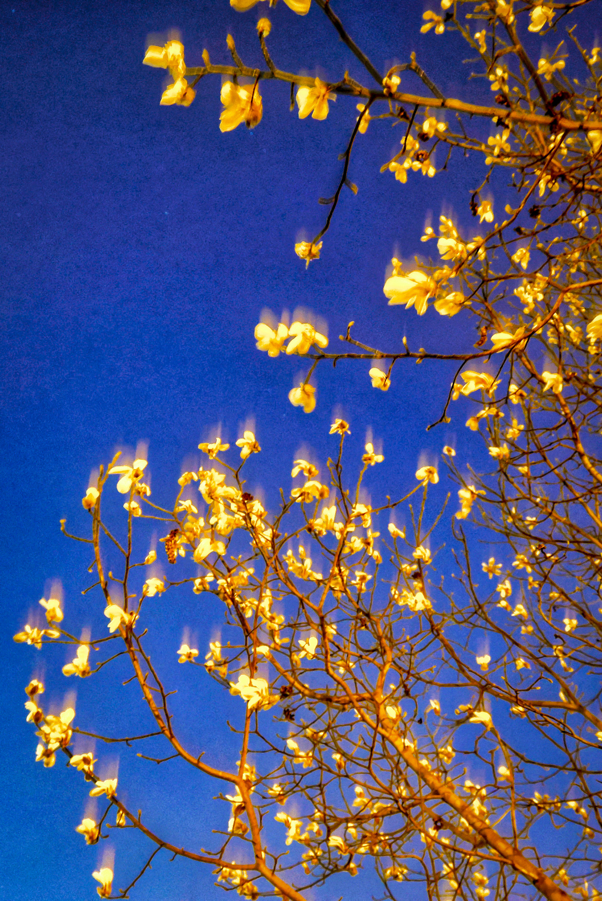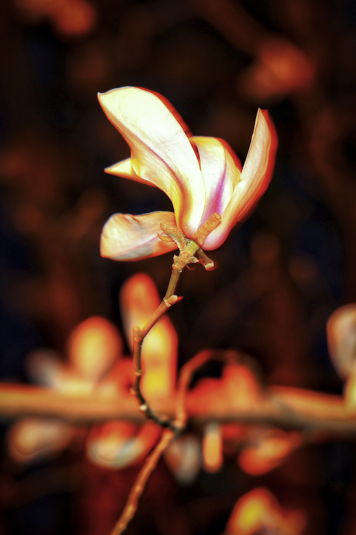 玉兰亭亭立在枝头,莹白与淡紫在暮色中愈发明艳,似一盏盏悄然点亮的灯,素雅端庄,清韵动人。