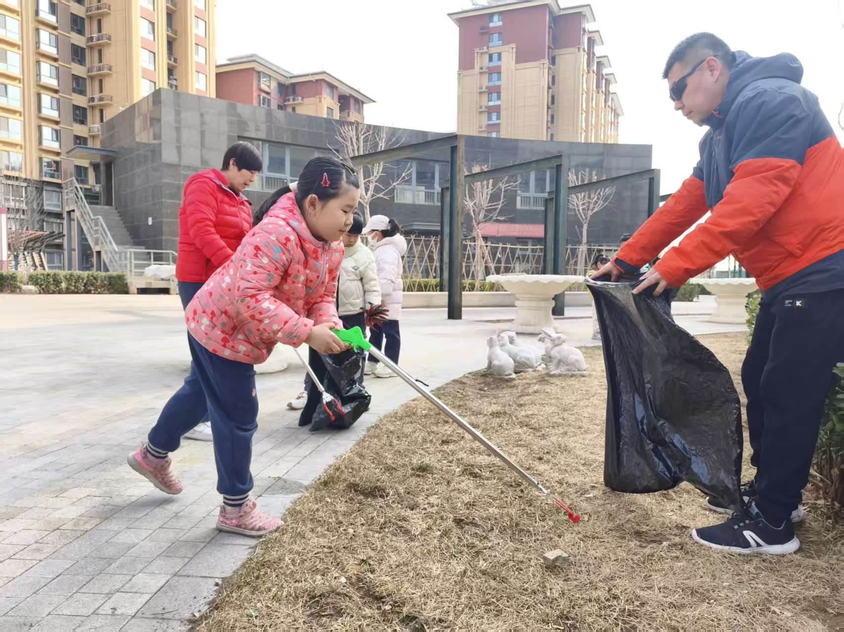 在金府社区和合顺家园社区,志愿者们将目光投向了小区外围道路及绿化带。他们弯腰俯身,仔细捡拾藏匿在绿植丛中的烟头、纸屑、包装袋等杂物,让小区绿化带重现清新的底色。