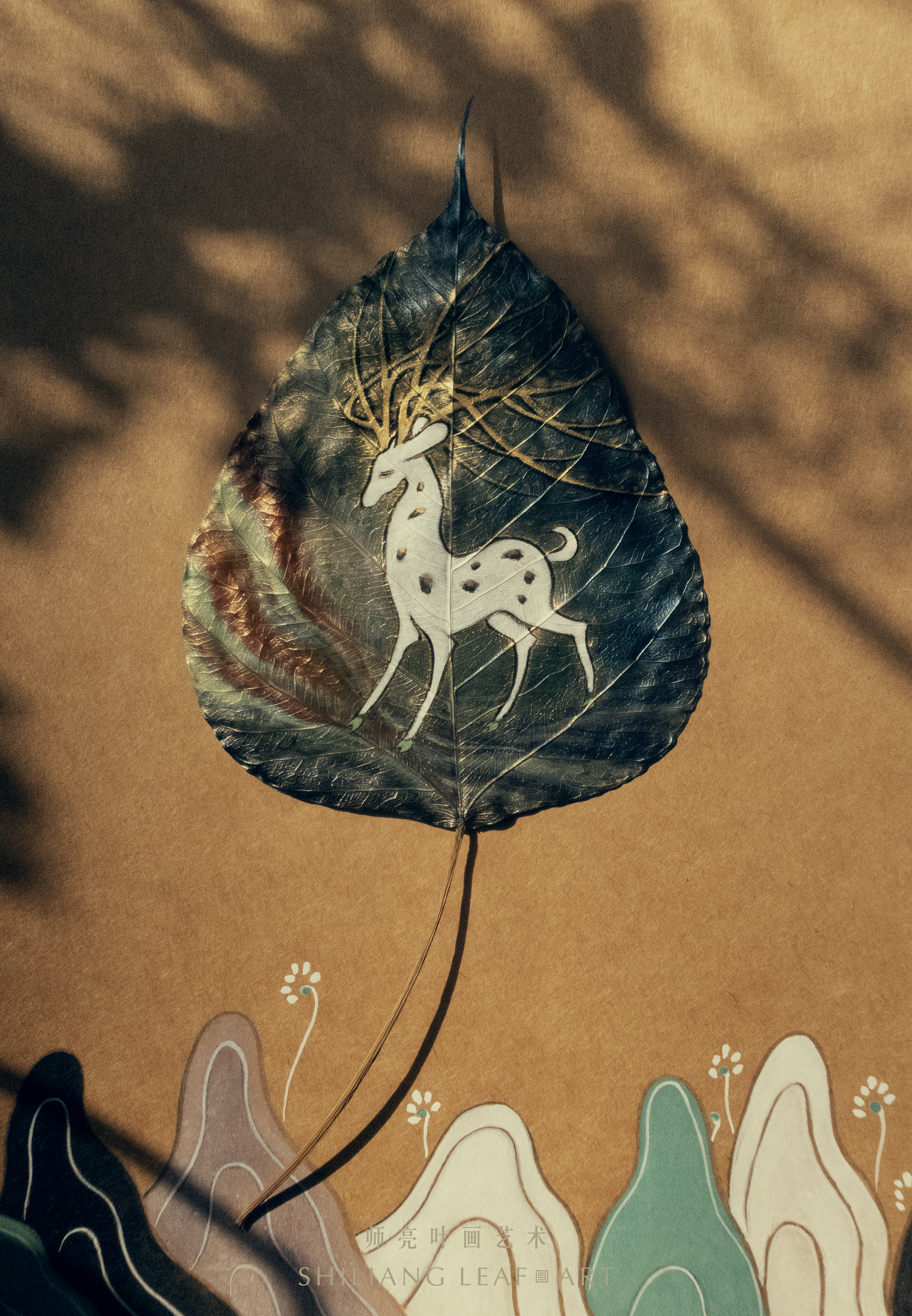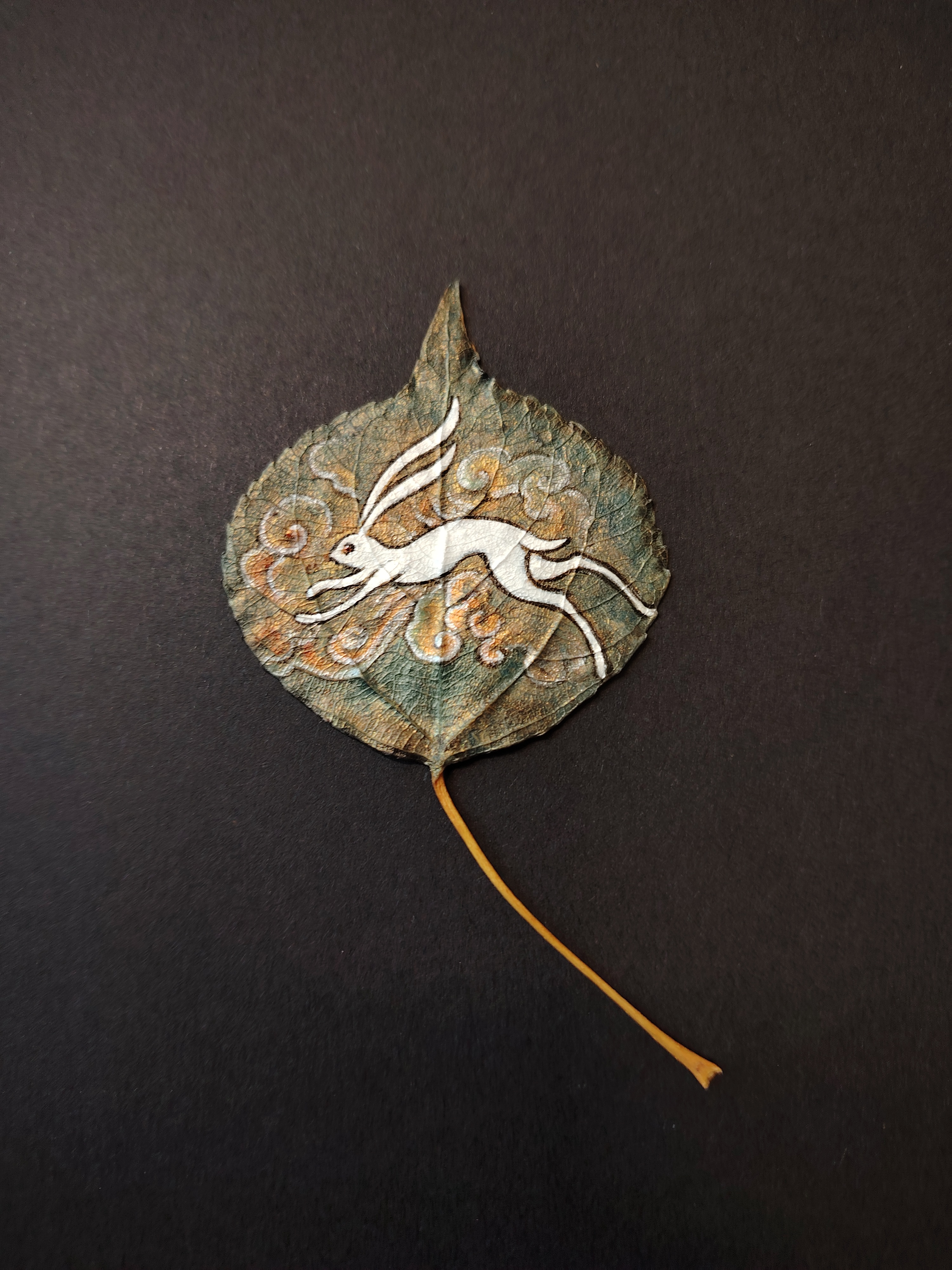 鹿王本生的故事在敦煌绚烂虚空里娓娓道来,天马驰骋于敦煌远山青黛的东方诗意里,欢庆女神幻化为敦煌飞天畅游星辰,月兔在敦煌云海间跳跃翻腾,这一切都在咫尺叶上精妙展现。