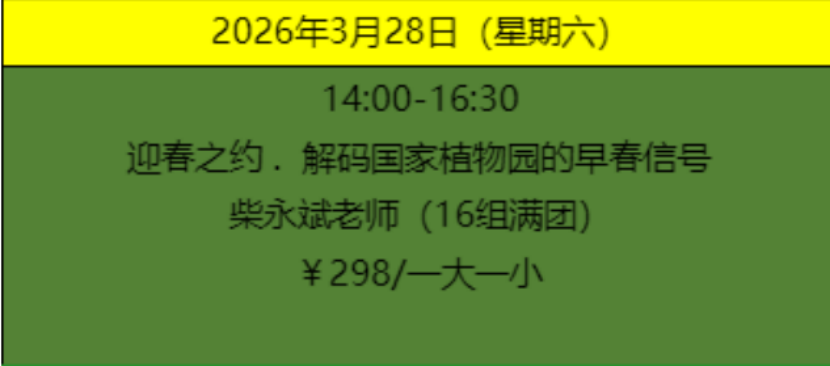 国家植物园“植趣不凡”研学课程——迎春之约· 解码国家植物园的早春信号将与大家见面,主讲人柴老师将带领大家一起解密植物的萌发-观测-探索之旅。