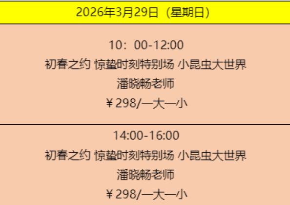 亲自动手挖掘将昆虫带回家:深入树立对昆虫的认知观与情感观,了解昆虫的“趣”与“乐”,以平等之心、责任之心,亲自动手挖掘深藏土壤中的昆虫幼崽,自行为其准备新家园,深度弥补惊蛰在家无虫陪伴的自然焦虑,自行感受昆虫变态发育的奇观变化;值得一提的是,本次挖掘将增设一批全新的昆虫盲盒,小潘老师为大家准备了很多来自非洲的神奇昆虫,一起期待。