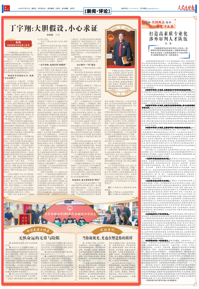 人民法官要精于专业,但不是机械、教条的精专,要让专业优势对齐法治需求,实现“三个效果”相统一,案子才真正办得好。“他不只是一个仅凭法条办事的法官。”高女士在央视采访中这样描述丁宇翔。那些大胆假设、小心求证,都源于“在乎”二字。因为在乎,所以不论是民生案件,还是后来从事金融审判承办的资本市场首案要案,他都不应付、不辜负。