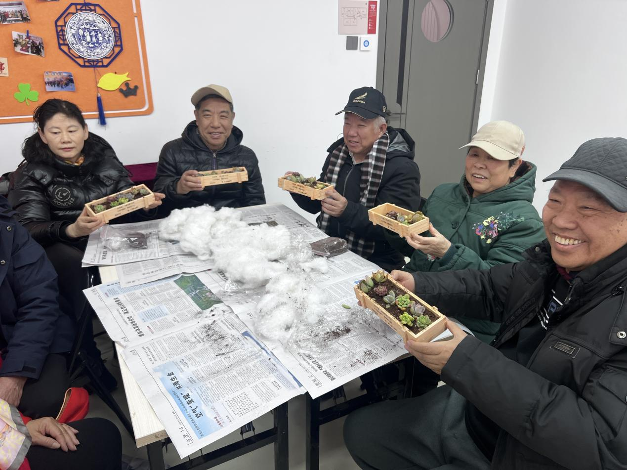 活动现场氛围温馨融洽,工作人员提前准备好多肉植株、营养土、花盆、园艺工具等物料,细致讲解多肉植物的生长习性、养护技巧及盆栽搭配要点,用通俗易懂的语言传递绿色种植知识。居民们认真聆听、踊跃提问,在工作人员的手把手指导下,填土、栽苗、造型,一步步打造专属多肉盆栽,指尖流转间,一盆盆小巧精致、生机盎然的多肉作品陆续成型。