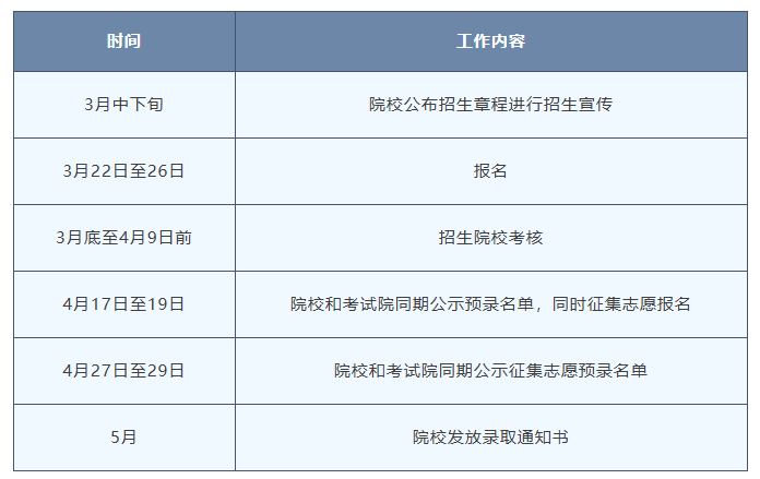招生院校按照全面衡量,择优录取的原则,结合高级中等教育阶段的学习情况和院校考核成绩,自主确定录取方案,公示预录取名单,办理录取手续。招生院校应于4月底前完成预录取。该批新生与当年高考录取的新生统一于秋季入学。