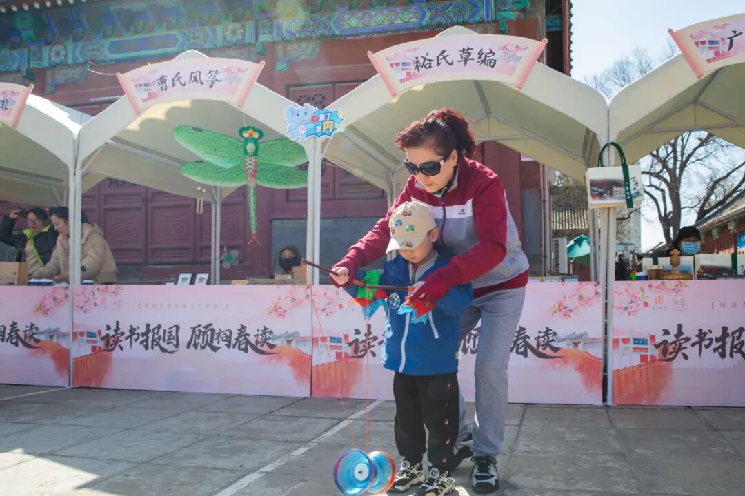 春风拂过书页,也唤醒了古祠院落的市井烟火,一场别开生面的“广内文化长廊”创意市集也随之鲜活开市,为这场春读活动增添了浓郁的烟火气息与互动乐趣。市集规划井然有序,各式特色摊位组成文化广场,一侧是由出版社单位联袂呈现的“书香长廊”,经典典籍与前沿读物俯拾皆是,不经意间就让游客翻阅出悦读之喜;另一侧则汇聚了北京蜡果、郭氏微雕、北京宫廷补绣、曹氏风筝、裕氏草编、京绣虎头鞋等琳琅满目的非遗传承项目,手工艺人们现场展示绝活,让沉睡于古籍中的技艺在指尖生动复现。此外,承载本地记忆的沈家本故居、宣南博物馆,以及张一元、国华商场、本真咖啡等老字号与文创新消费品牌也齐聚一堂,共同绘制了一幅“可读、可赏、可品、可购”的社区文化生活全景图。
