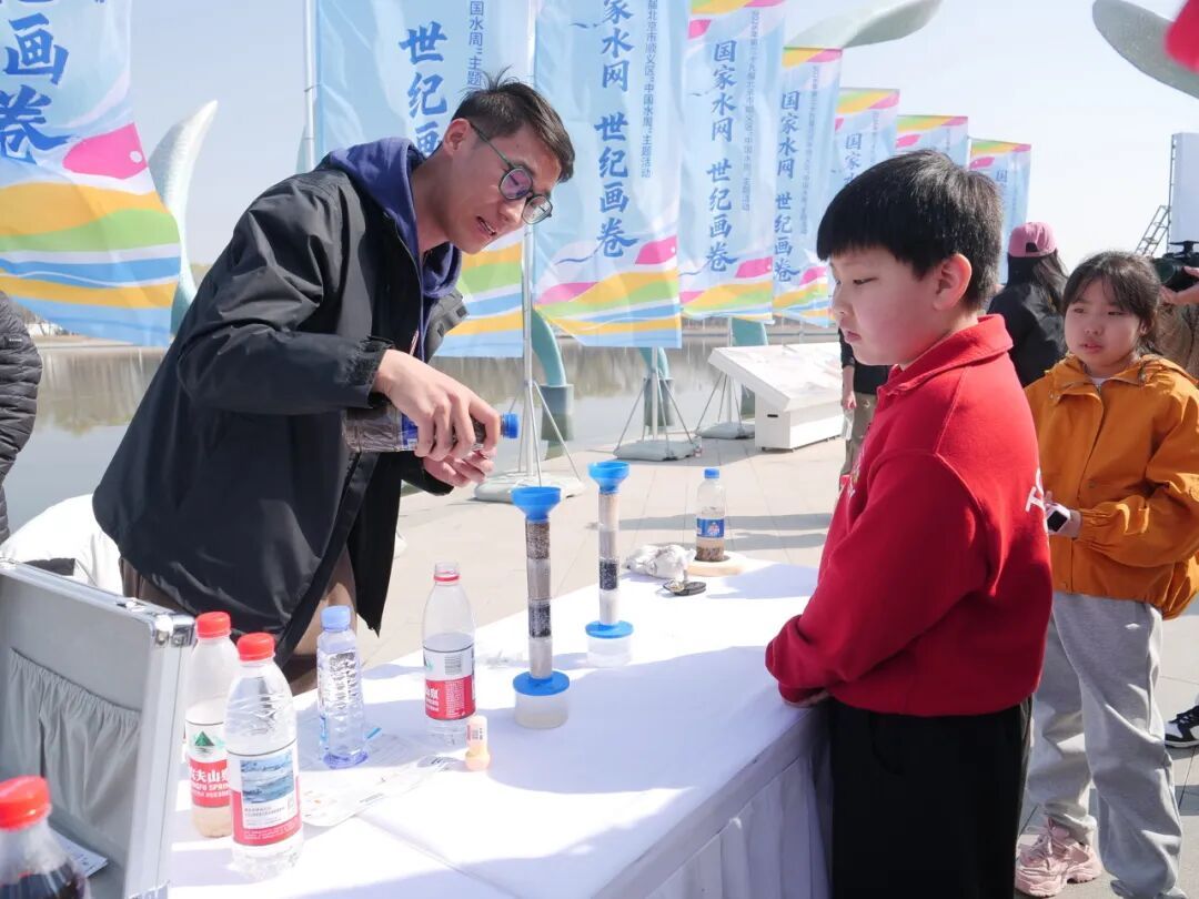活动现场,孩子们围在水科学小实验的展台前,见证清水在试管中分层、变色的奇妙变化;舞台上,水资源主题歌舞、节水手势舞轮番上演,节水代表们的朗诵声在湖畔回荡。尤为引人注目的是顺义水系拼图亮相,一条条河道、一汪汪湖泉在市民心中变得清晰可感,大家在沉浸式体验中,深刻读懂水资源的珍贵。