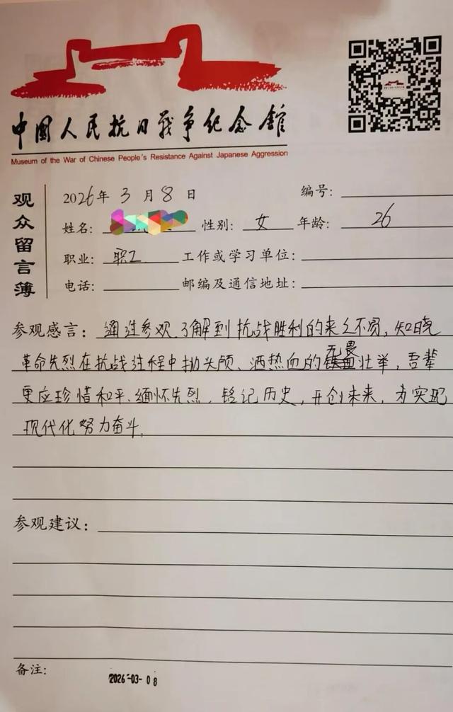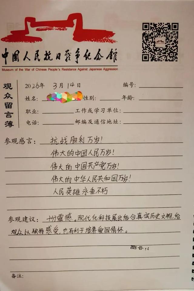 3月14日,观众写下铿锵誓言:“抗战胜利万岁!伟大的中国人民万岁!伟大的中国共产党万岁!伟大的中华人民共和国万岁!人民英雄永垂不朽!” 这是穿越时空的致敬,刻入血脉的信仰。同时,观众也对现代化科技展陈与文物结合的形式给予高度评价,认可其在培育爱国情怀上的积极作用。这既是对展馆工作的肯定,更是红色教育实效的生动印证。