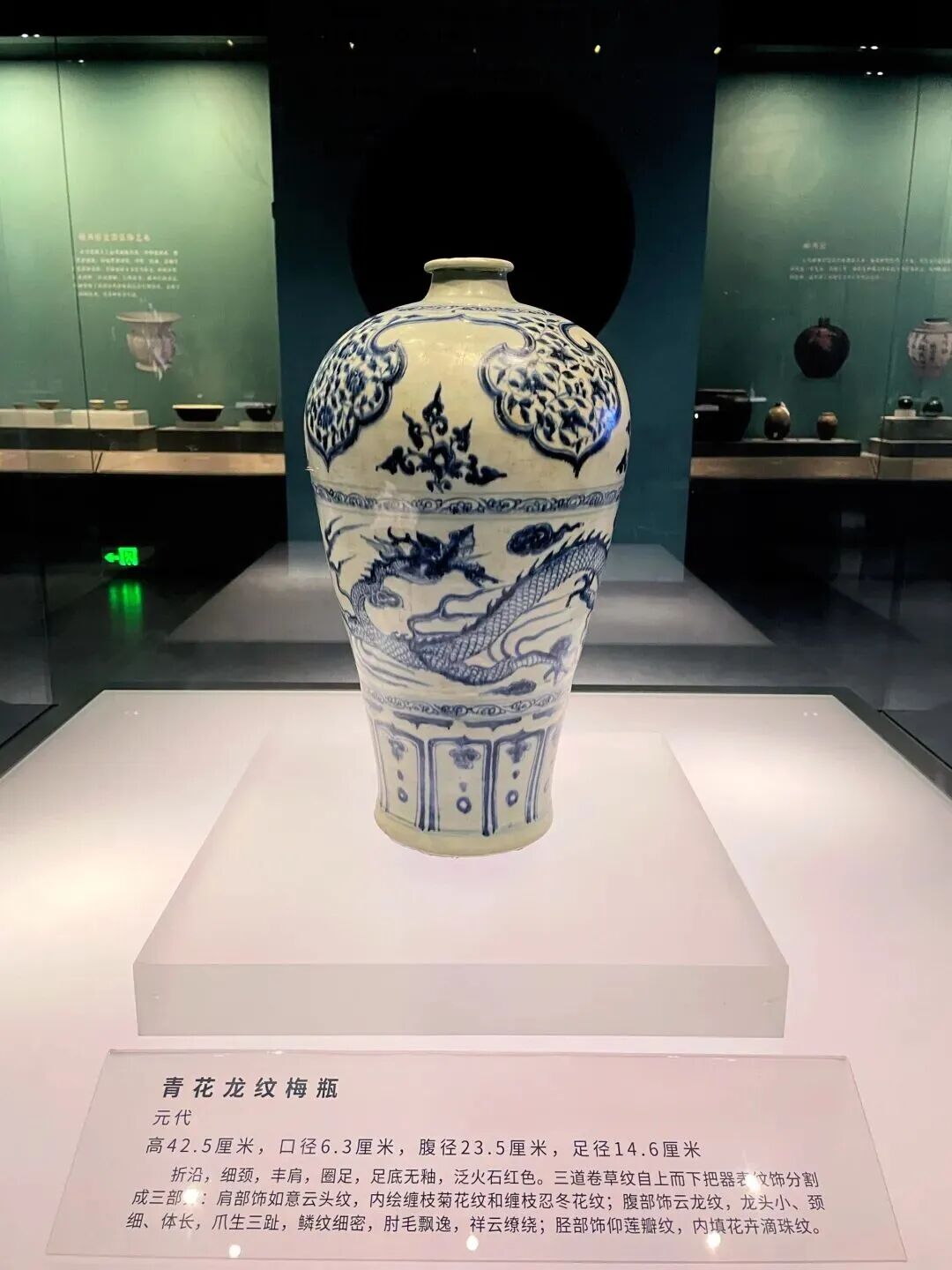 青花龙纹梅瓶,胎体洁白,釉色晶莹,呈色明艳,纹饰繁缛,是典型的“至正型”元代青花瓷器。白釉泛青, 内壁不施釉,外底无釉,外壁沾有少量铁锈。
