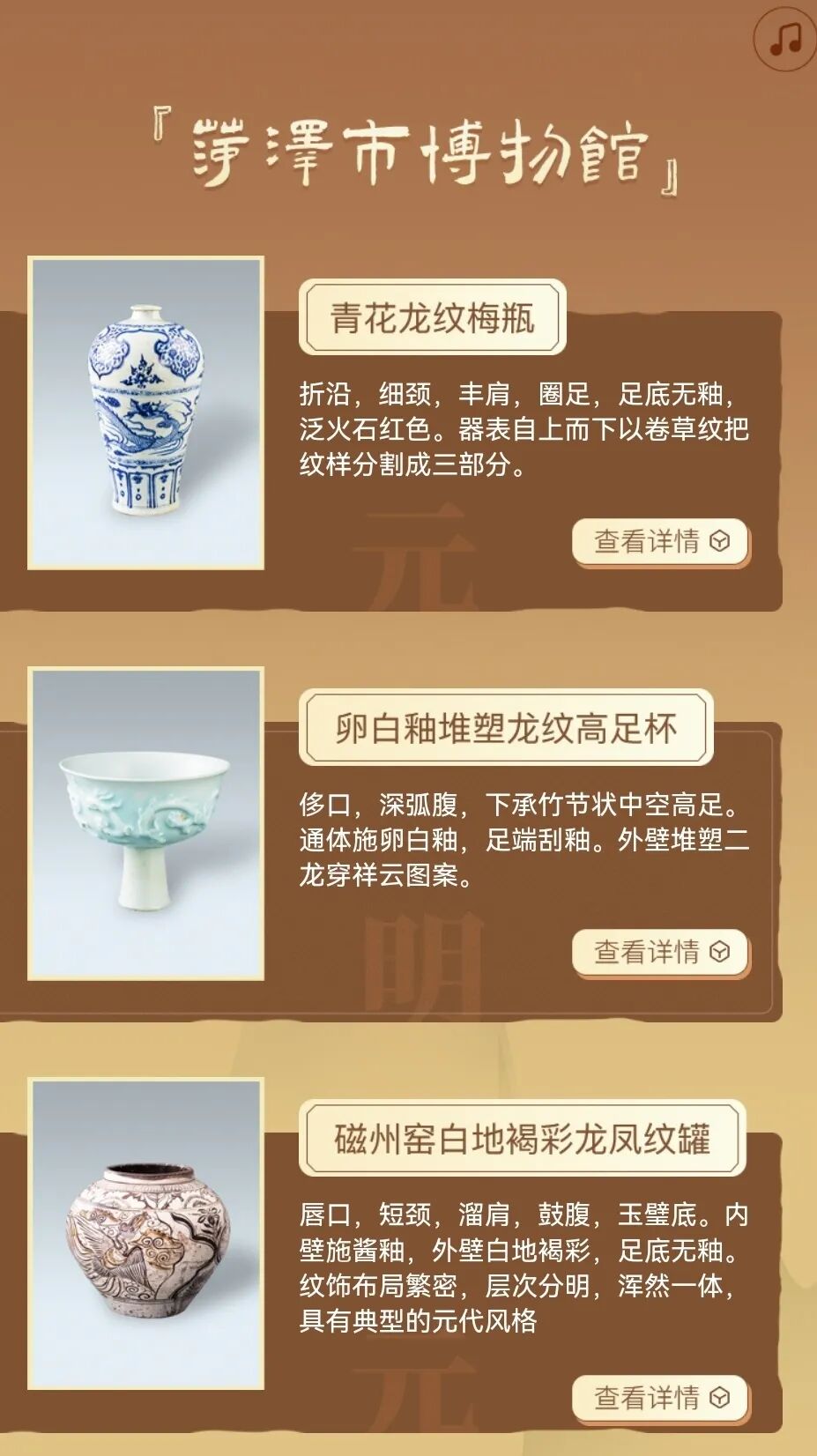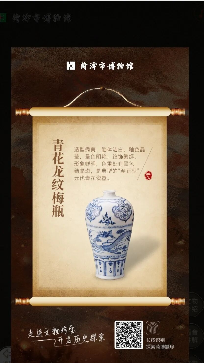 在菏泽市博物馆,这件青花龙纹梅瓶以数字形式焕发新生。“菏博撷珍”板块上线,点击即可查看文物详情、聆听语音讲解。