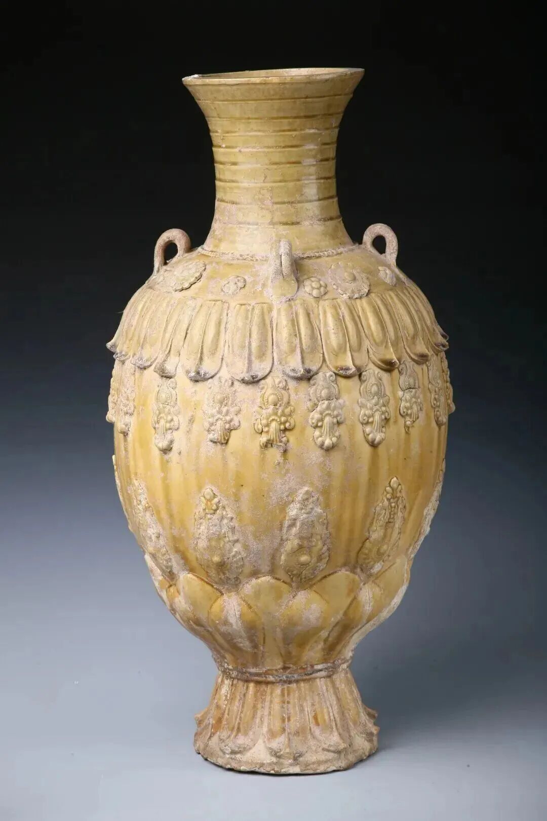 青釉莲花尊庄重挺拔,造型浑厚,纹饰繁缛,是汇集划花、堆贴、印花等工艺为一体的艺术珍品。此件莲花尊无论从造型、釉色还是纹饰上都几乎毫无缺陷,代表了当时中国瓷器生产的最高成就。