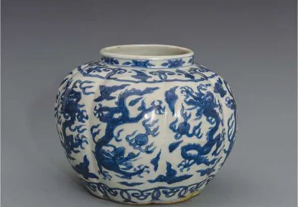 青花云龙纹瓜棱罐的器型在明代较为流行,嘉靖、万历时期烧制量较大,该时期的瓜棱罐胸径往往大于或接近罐的高度,瓜棱深、起伏大,圆润丰腴,呈花瓣状,视觉极具美感。