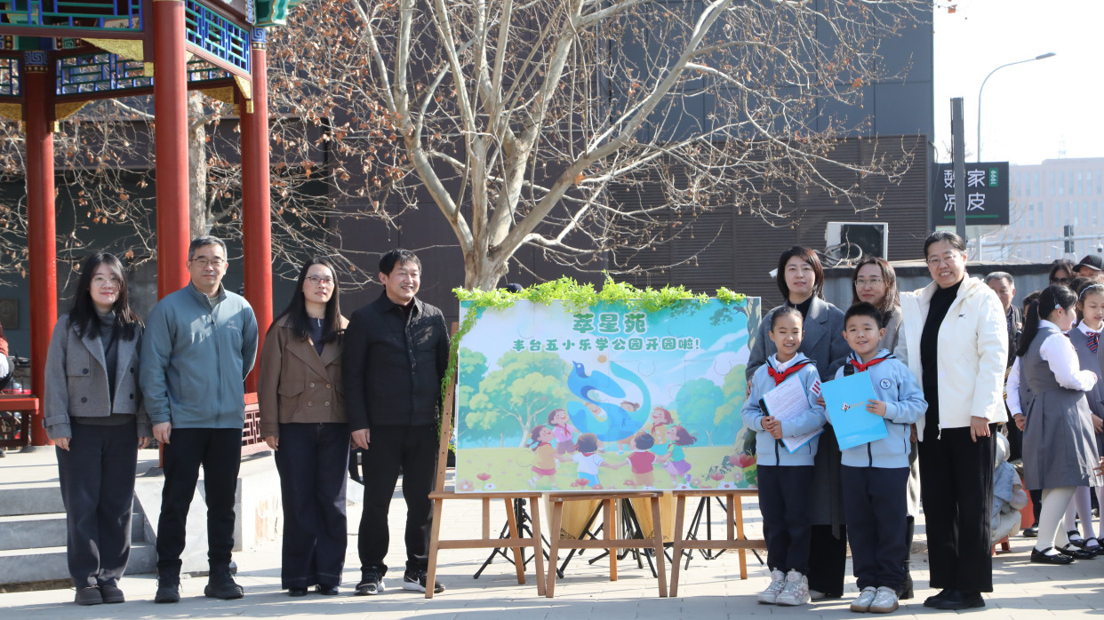 活动以揭幕仪式拉开序幕。丰台区教委、区公园管理中心、丰台街道相关负责人,丰台五小校长李健与学校家长代表共同走到“萃星苑”乐学公园活动启动牌前,掀开覆盖其上的柳条,活动牌上由师生共同设计的乐学公园标志显露出来。从去年5月乐学公园正式命名,到地景设计、月季种植、志愿服务等系列课程落地,如今,随着柳条掀开,这片承载着校家社合力育人初心的乐土,在春日里翻开了新的一页。