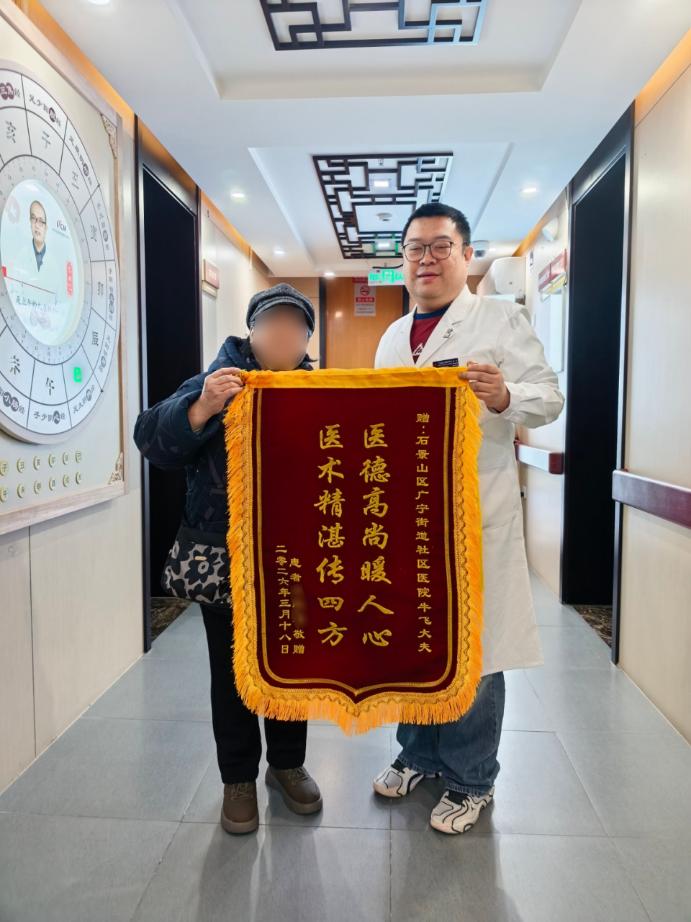 近日,家住西城区白云观的刘阿姨专程来到广宁街道社区卫生服务中心,为中医科副主任,中医师牛飞送来锦旗,以此表达对他精湛医术与暖心服务的由衷感激。