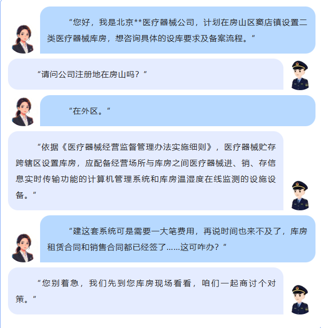 不久前,某医疗器械公司的咨询电话打到了房山区市场监管局,得知跨区设库的条件之后犯了愁,窦店所工作人员主动向前一步,迅速启动科所联动机制,上门走访企业。