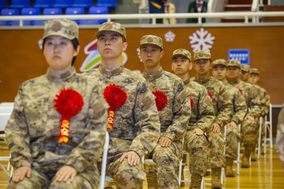欢送大会在庄严的国歌声中拉开帷幕,激昂的旋律响彻全场,激荡着每一位在场人员的爱国情怀。鲜艳的横幅、光荣的红花和绶带、振奋人心的口号……全区百余名新兵身着崭新军装,精神抖擞,整齐列队,眼神中满是对军营生活的憧憬与对守护家国的坚定。
