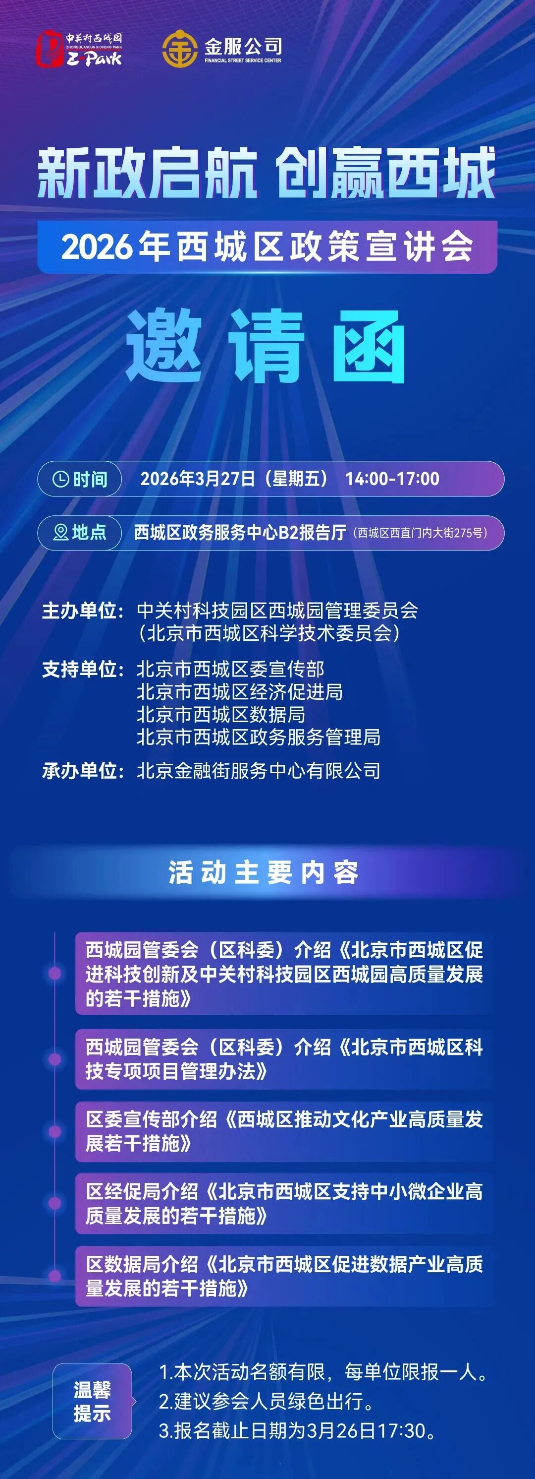 西城园管委会(区科委)拟于近期开展“科创十二条”政策兑现工作,为做好政策解读与申报辅导,助力企业高效完成政策申报工作,西城园管委会(区科委)牵头联合区委宣传部、区经济和信息化局、区数据局、区政务服务局共同举办2026年西城区政策宣讲会,同步开展全区产业政策集中宣讲,请各企业有关人员积极报名参会。