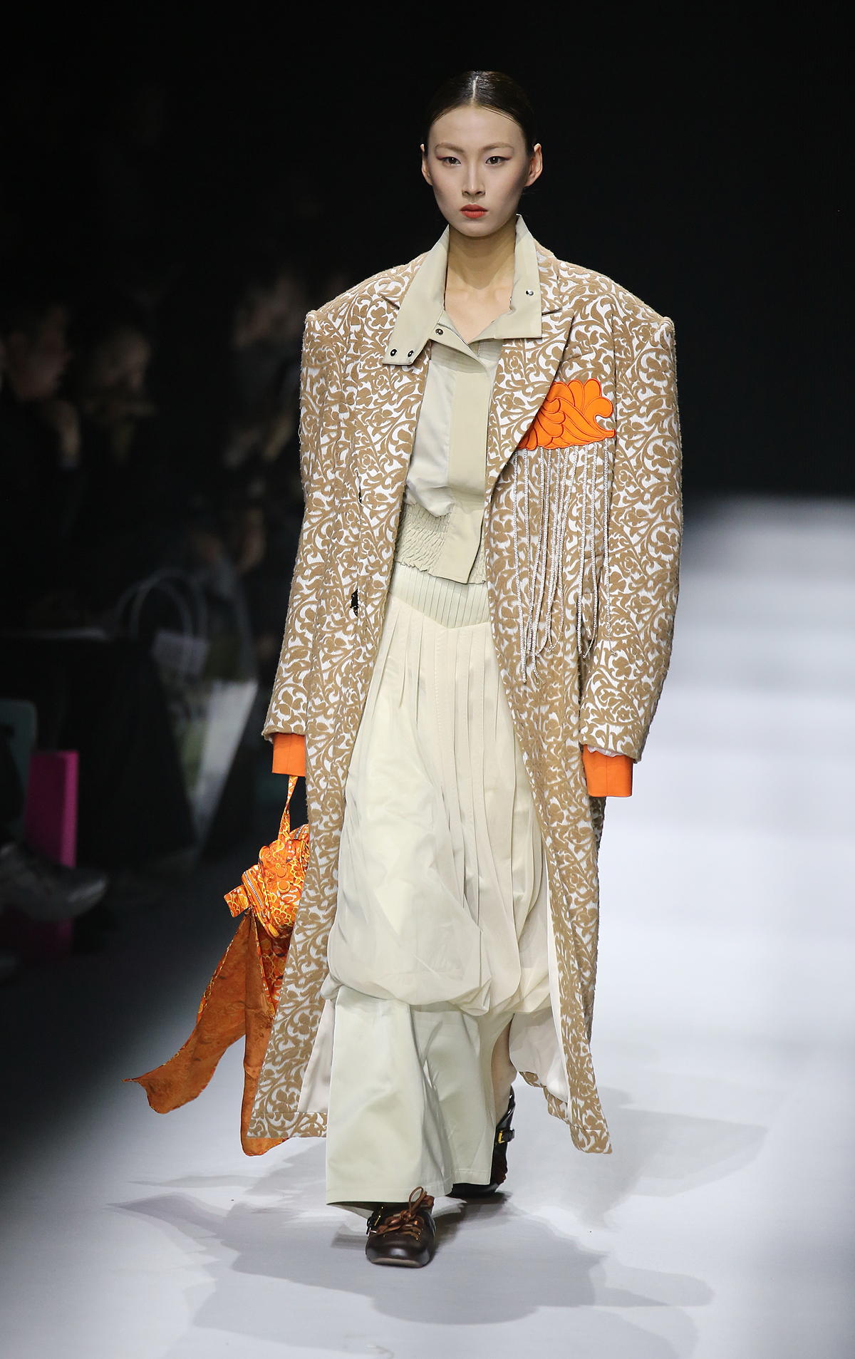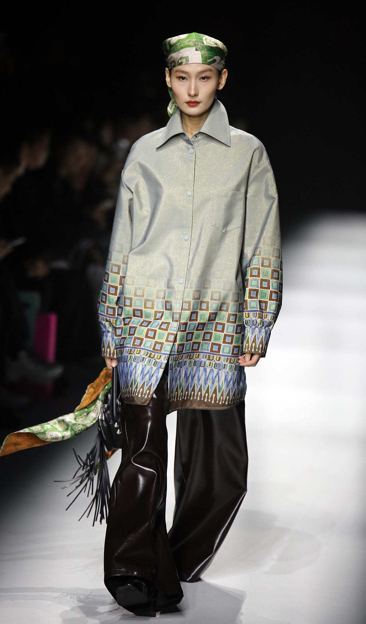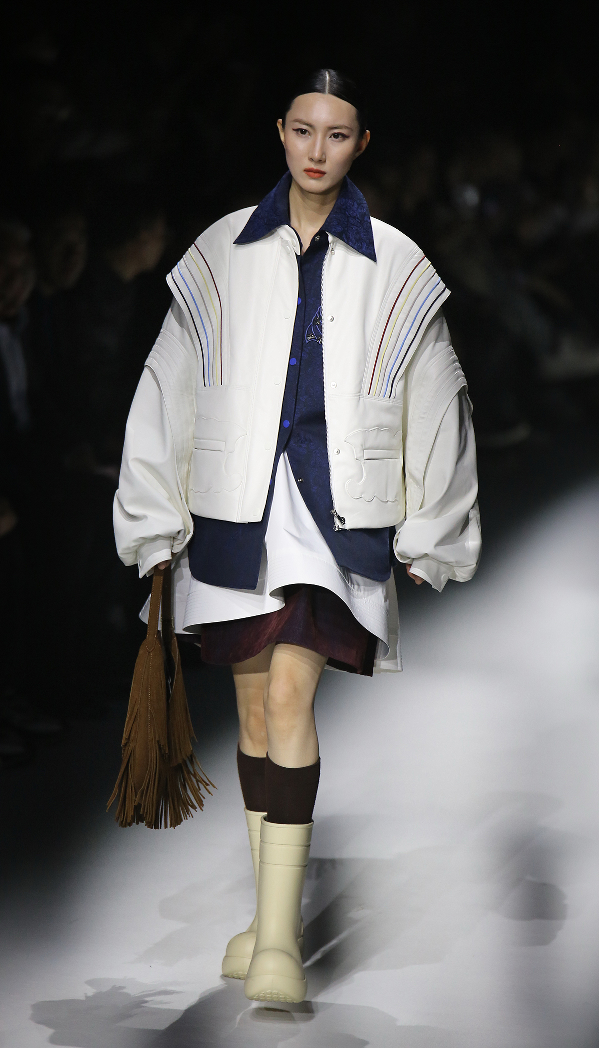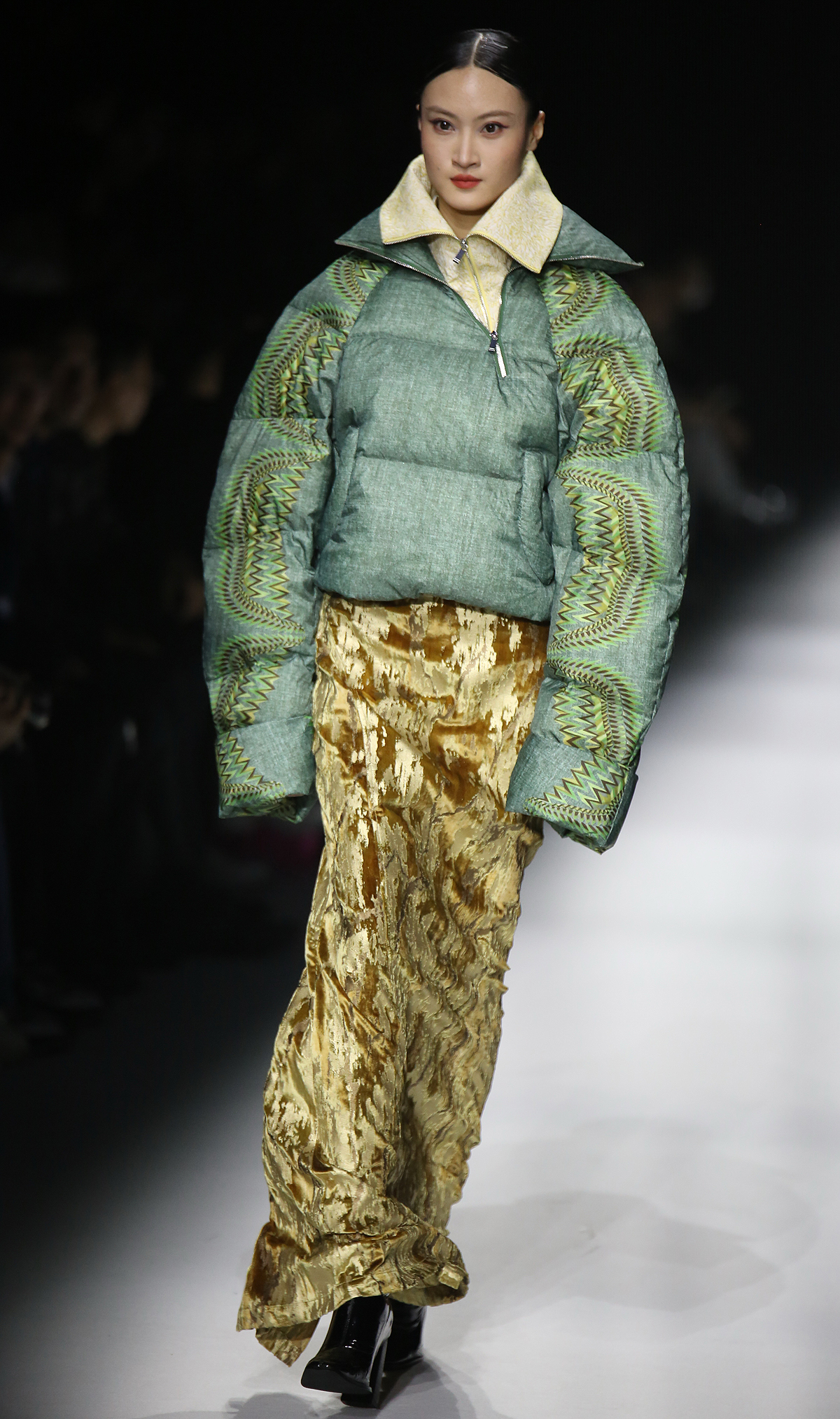 3月24日,设计师刘伟霞携新作登陆2026年中国国际时装周(春季),发布全新系列「漠境未来」。这是一场以敦煌为起点、以未来为指向的时装叙事,设计师以时空为衣,将古老文明的瑰丽底色,织入当代时装的先锋语言。让非遗纹样在时装之上新生,让敦煌风骨,走向未来时尚。图为模特精彩演绎设计师刘伟霞的作品。