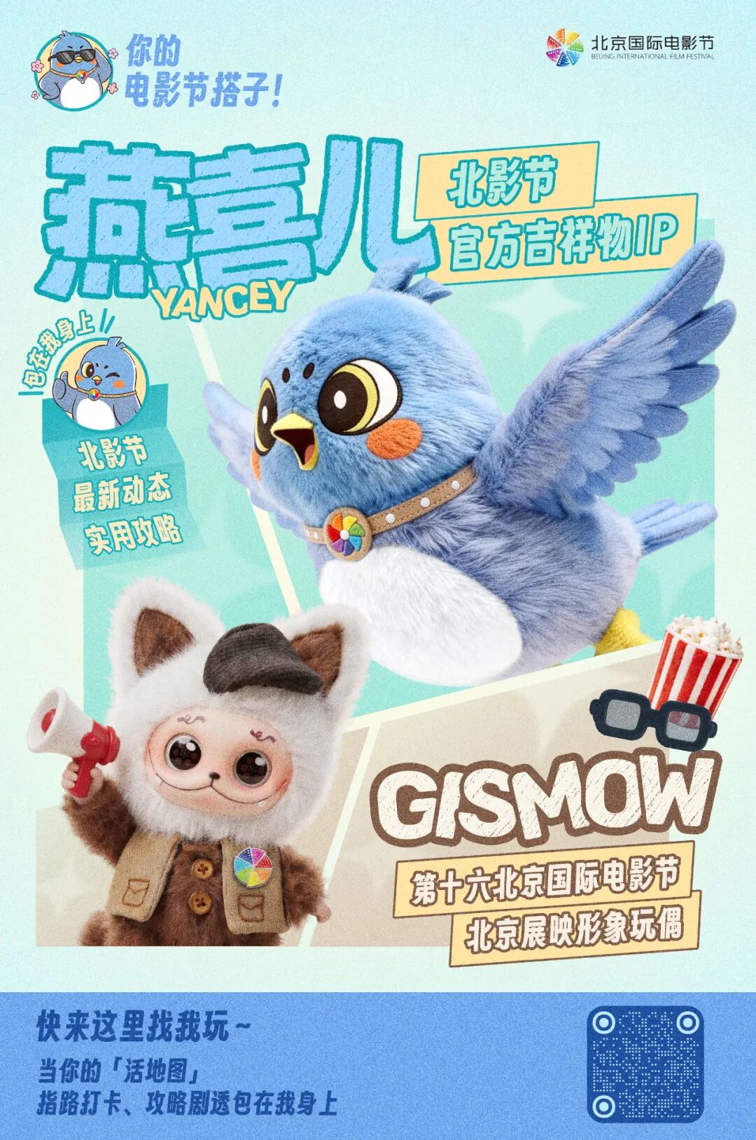 第十六届北京国际电影节专属“观影搭子”作为本届北影节的“东道主”,燕喜儿早已为这场光影盛宴做好了万全准备。“燕”是北京古城跨越千年的文化符号,“喜”是设宴喜迎八方客的满满诚意。从坐镇全场的导演、冲在一线的记者、盛装出席的嘉宾,到沉浸式观影的影迷、暖心护航的志愿者和鞠躬尽瘁的打工人,六种不同身份的燕喜儿,将穿梭在北影节的每一个角落,全程陪伴大家的光影之旅。燕喜儿专属表情包也将同步上线,还有超多趣味互动玩法等你解锁。本届北影节的北京展映单元,也迎来了一位潮玩伙伴——GISMOW。作为本届北影节北京展映形象玩偶,GISMOW将电影艺术的经典符号融入设计细节:贝雷帽致敬电影创作者的匠心坚守,手持喇叭还原片场调度的鲜活场景,复古马甲复刻经典导演穿搭,每一处巧思,都藏着对电影艺术的赤诚敬意。无论是奔赴影院赴一场光影之约,还是打卡北影节各类精彩的“电影+”活动,燕喜儿与GISMOW都将作为你的专属搭子,相伴左右。