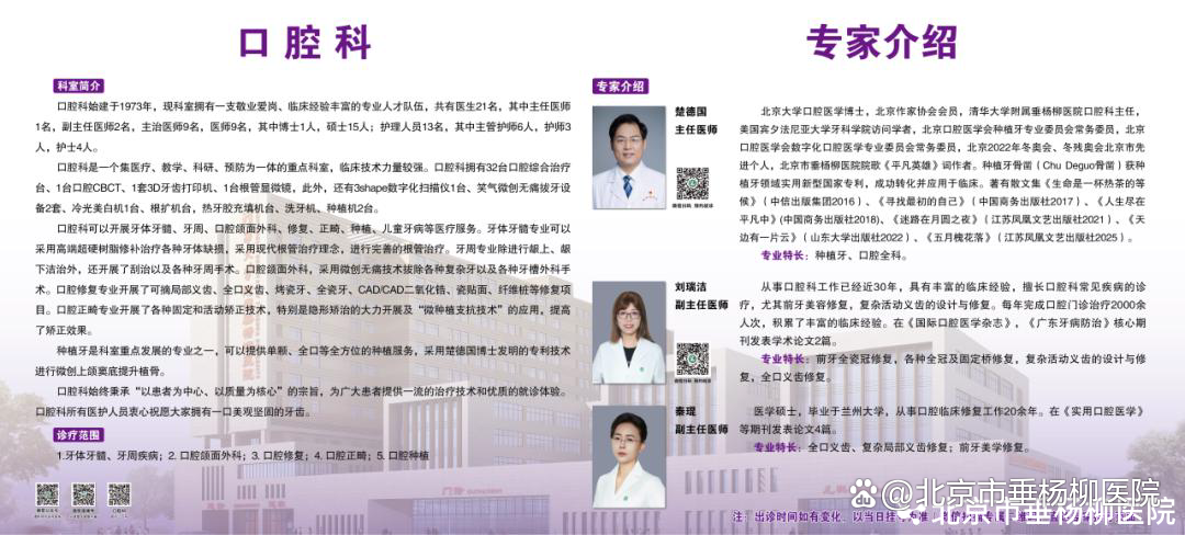 口腔科现有医师26名,其中主任医师1名、副主任医师2名,博士2名、硕士24名。学科带头人楚德国主任为北京大学口腔医学博士、硕士生导师,任职北京口腔医学会种植牙专委会常委等职。