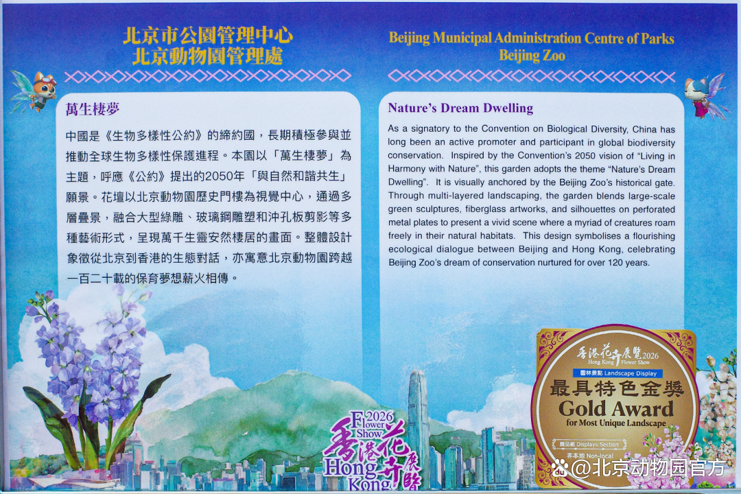 作为历年花展的焦点之一,北京展位今年以独特的设计语言,向世界展示古都园林艺术的深厚底蕴与现代创新。今年北京动物园管理处作为北京市属公园代表,自主设计“万生栖梦”主题花坛,荣获“最具特色金奖”。