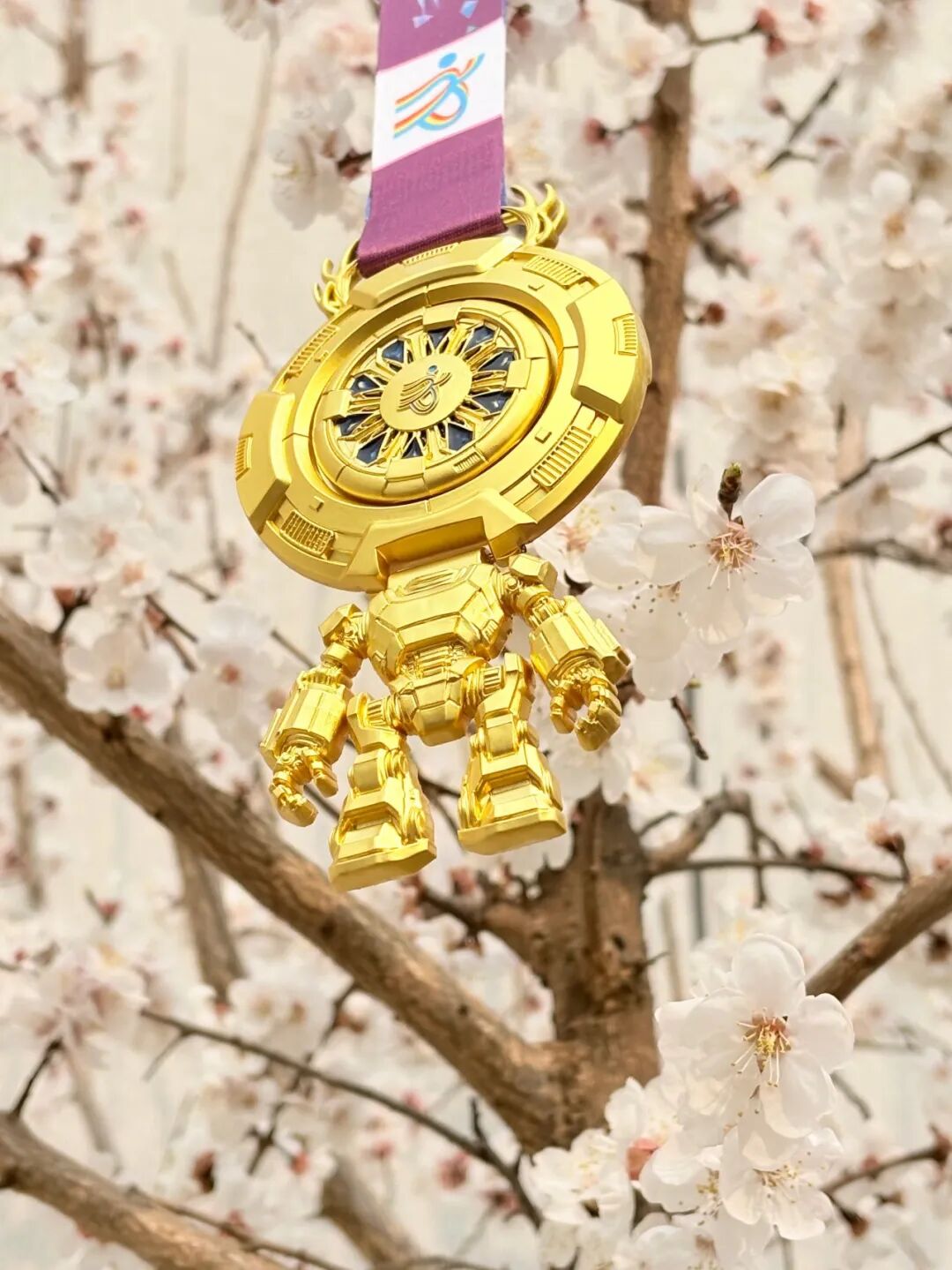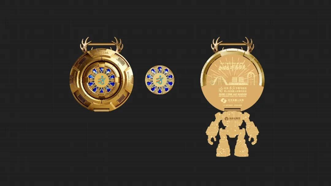 奖牌创新采用可展开结构,展开部分化身人形机器人躯体,与上方圆形主体组合,构成立体生动的人形机器人形态。整体兼具艺术观赏性与互动趣味性,以科技互动之趣致敬亦庄智能产业先锋姿态,也为每一位完赛跑者带来独一无二的纪念体验。