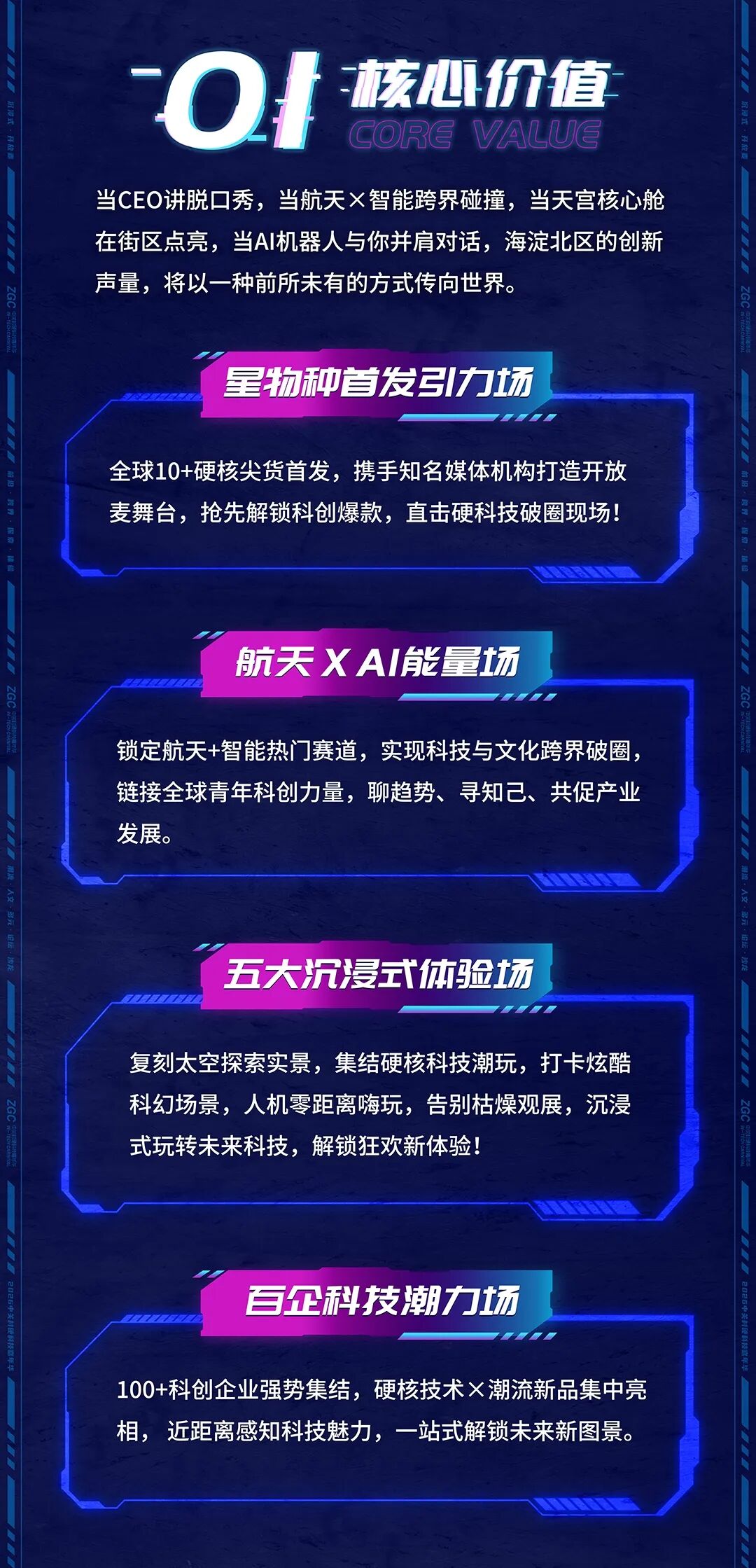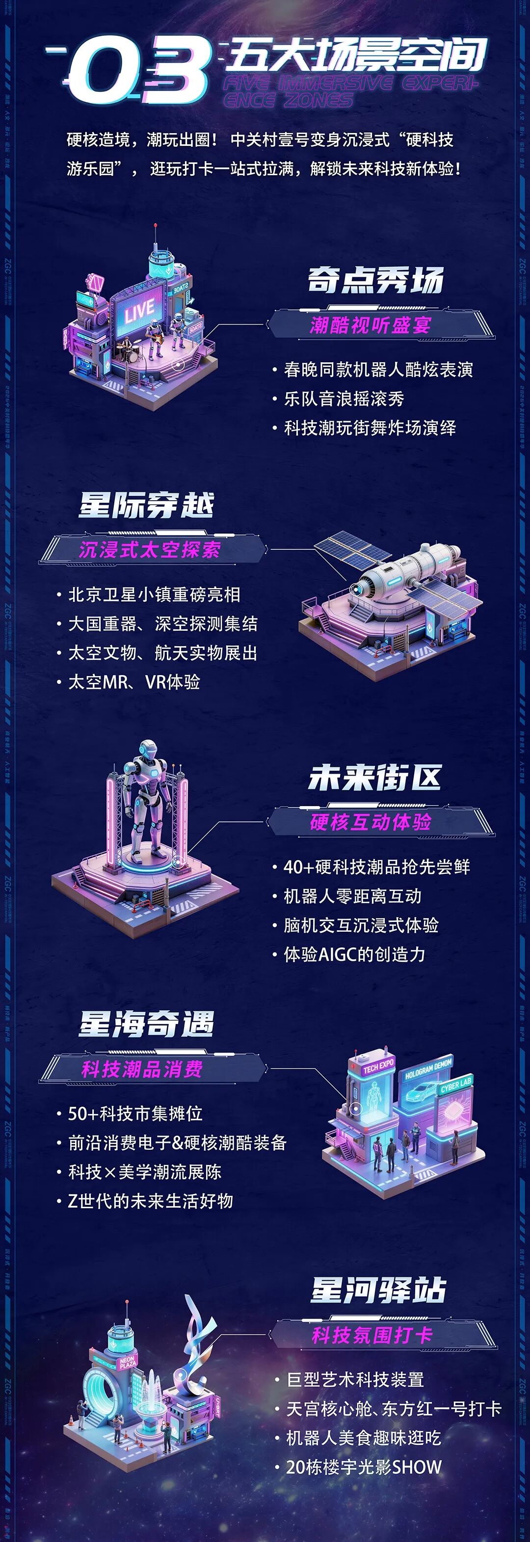 奇点秀场作为核心视听阵地,集结科技脱口秀、春晚同款机器人表演、乐队摇滚秀、科技潮玩街舞演绎等内容,实现科技与艺术的双向赋能;星际穿越则聚焦太空探索体验,北京卫星小镇携40+商业航天企业重磅亮相,深空探测成果、航天实物展品集中展出,让大众近距离拥抱航天梦想;未来街区主打互动体验,40余款硬科技潮品集中展出,机器人互动、脑机交互、AIGC创作等玩法,沉浸式感受前沿科技;星海奇遇聚焦科技潮品市集,50余个特色摊位集结前沿消费电子、硬核装备,汇聚Z世代的未来生活好物;星河驿站汇聚天宫核心舱、“东方红一号”卫星等巨型装置,搭配楼宇灯光秀、机器人美食体验,实现科技与美学深度交融。