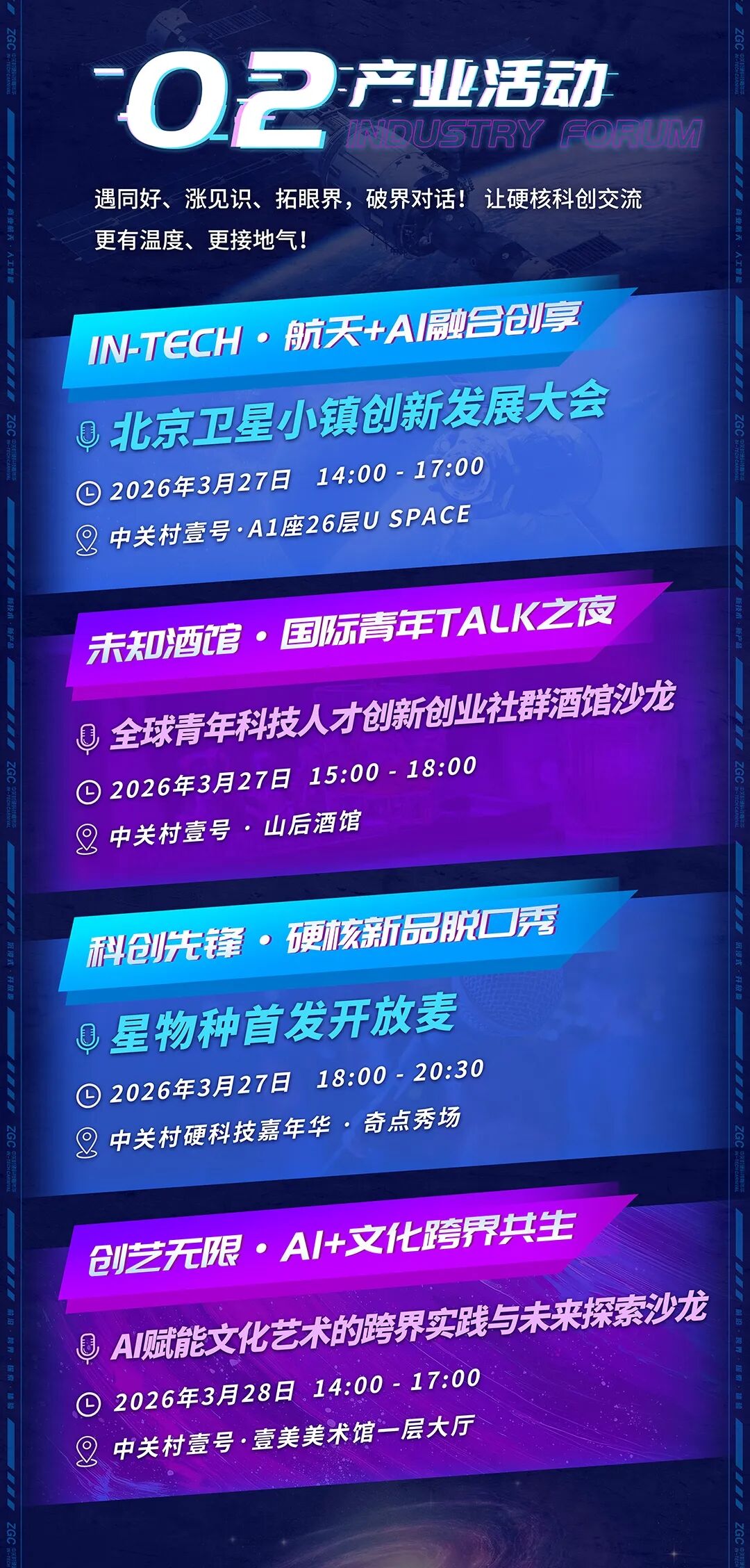 嘉年华期间,三大特色产业活动同步发力。北京卫星小镇创新发展大会,聚焦“航天+AI”核心议题,以深度产业碰撞凝聚发展共识、打通合作链路,寻求同行共赢发展,切实助力商业航天产业提质升级;全球青年科技人才创新创业社群中外青年酒馆沙龙,搭建国际化社交平台,在轻松氛围中分享创业经验、碰撞创新灵感,为产业发展储备国际化青年人才;AI赋能文化艺术跨界实践沙龙,打破科技与艺术的次元壁,推动AI技术与文化创作深度融合,探索数智时代艺术表达新范式,激发创意融合新可能。