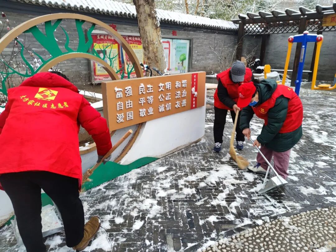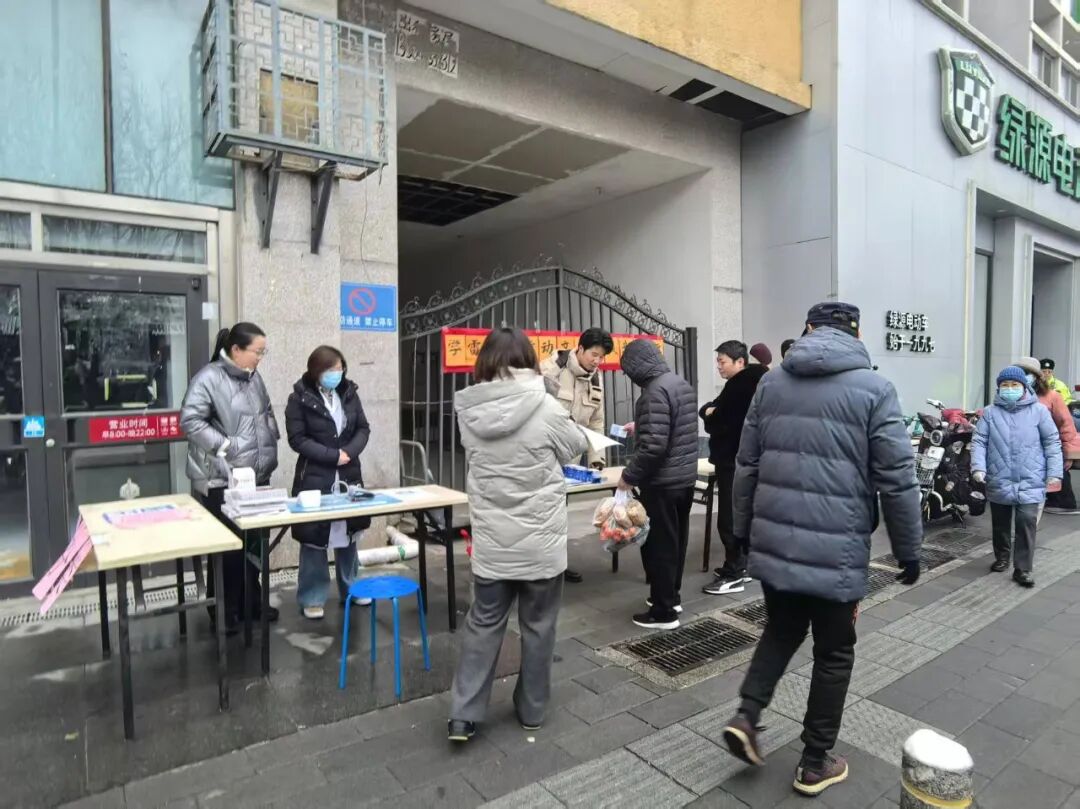 新鲜社区学雷锋志愿服务活动:开展便民服务+环境整治,提供血压血糖检测、电动车检修、金融反诈宣传,同步冒雪扫雪铲冰。