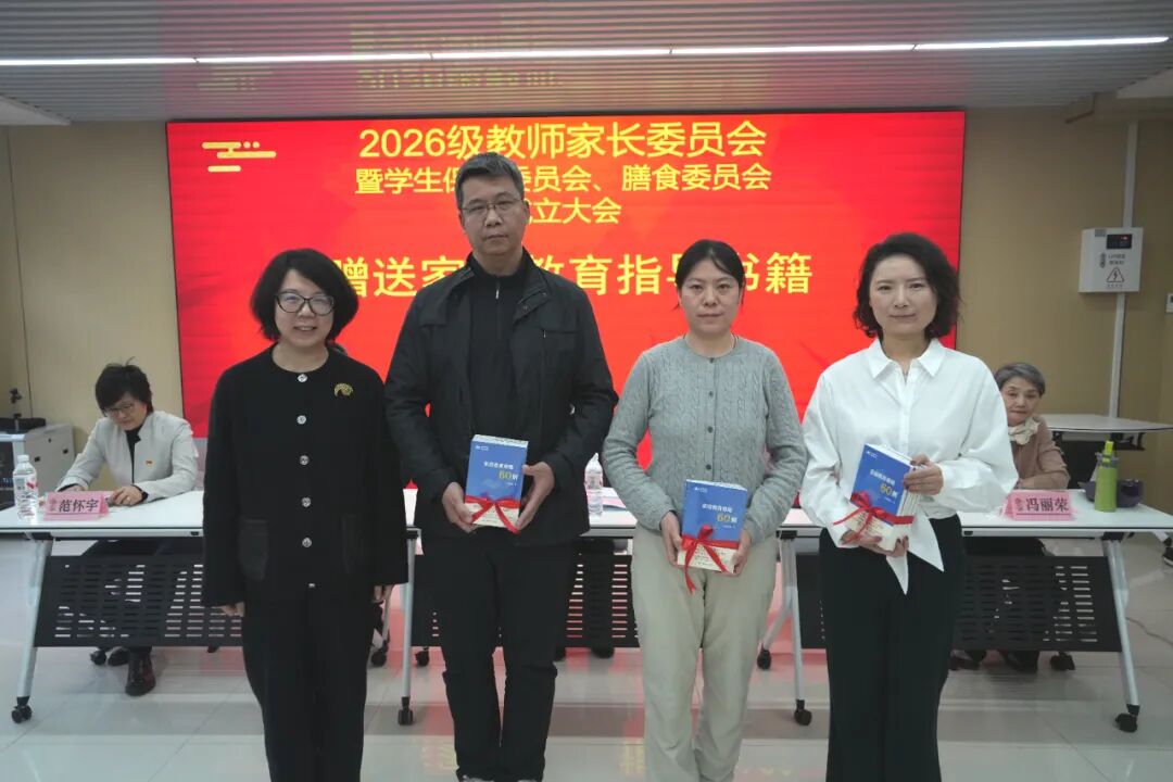 王萌校长向家委会代表赠送家庭教育书籍,愿校家共学共进,以科学之力,护成长之路。